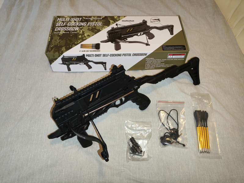 Zubehör: Alles was auf dem Foto zusehen ist. Leider ist mir beim Test ein Bolzen kaputt gegangen aus diesem Grund sind es 6 Bolzen, dafür lege ich einen laser zum Zielen mit dabei! Ansonsten, alles im Neuzustand da ich nur 10 mal geschossen habe.