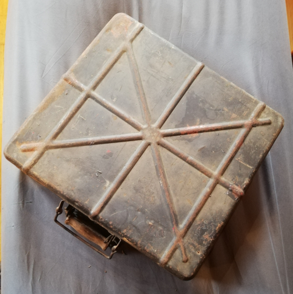 Transportkasten für 3,7cm FlaK-Patronen mit Innenleben, Originalfarbe und Beschriftung. Verschluss komplett. Eine der Scharnierleisten fehlt.