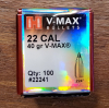 Zum Verkauf kommen 100 Geschosse Typ Hornady V-Max im Kaliber. 22 mit 40 Grain Gewicht.