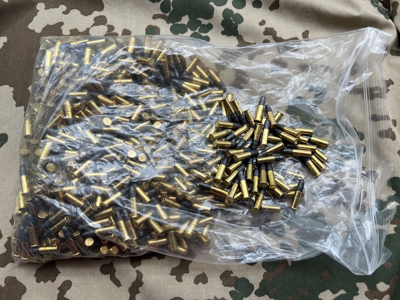 Die Menge wurde gewogen, nicht gezählt, dann hochgerechnet. Sollten es daher „nur“ 689 Patronen sein, kann das eine Rechnendifferenz sein, und sicher keine Absicht. Wer damit ein Problem hat, sollte nicht mitbieten. Der gesamte Posten wiegt knapp 2800 gramm, eine Patrone wiegt 4 gramm, den Rest kann man errechnen.