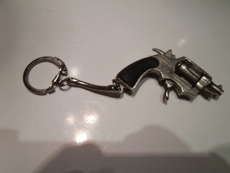 Älterer Schlüsselanhänger in Form eines Revolvers. Linke Seite beschriftet MIDGET, rechte Seite ROMO. Hergestellt Made in Hong Kong. Wenn der Hahn gespannt wird lässt sich die Trommel aufklappen und ein Zündplättchen einlegen. Es knallt aber nicht mehr nach Betätigung des Abzuges, da das Plättchen rausrutschte. Vielleicht funktioniert es, wenn es festgeklebt wird. In der Normalstellung ist die Trommel fest.