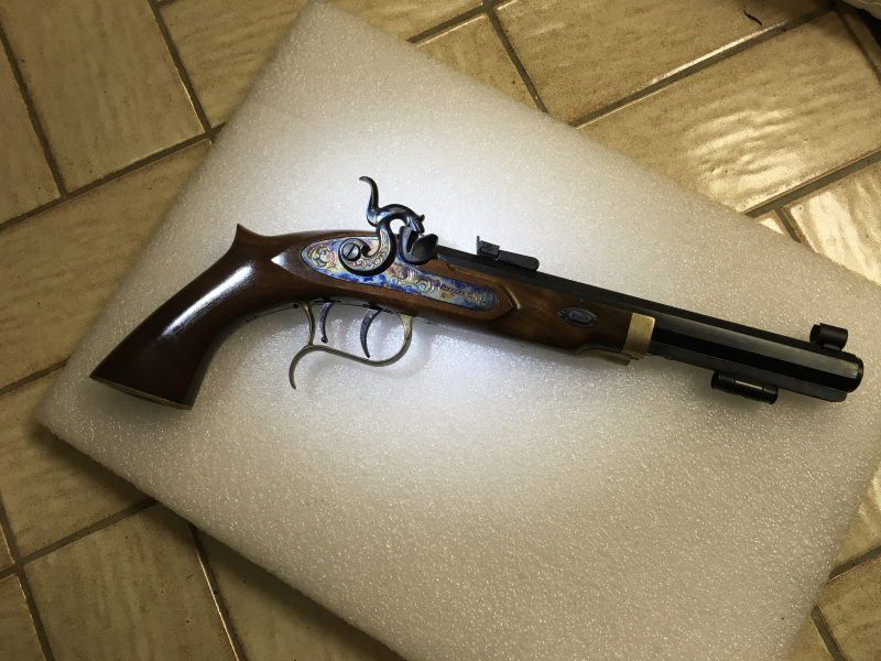 Zur Auktion steht eine absolut neuwertige Patriot in Caliber.45, frühe Herstellung von 1979! Die Waffe besitzt zu 99,9% noch die originale, tiefschwarze Brünierung. Das Laufinnere ist makellos und verfügt über scharfe Züge und Felder. Das Schloss besitzt eine auffallend schöne Bunthärtung, der Hahn hat minimalste Gebrauchsspuren, siehe Bild. Leider fehlt der Ladestock. Altersnachweis, Bilder sind Bestandteil der Auktion.