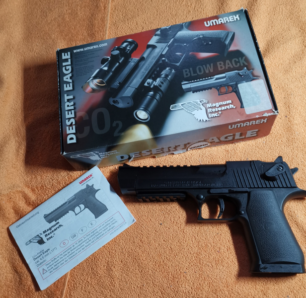 Die „Desert Eagle“, eine mächtige und legendäre Großkaliberwaffe von „IMI“, findet im lizenzierten CO2-Pendant von UMAREX eine optisch sehr detailgetreue Replik, die auch in ihren Abmaßen exakt dem Original entspricht. Was dem Betrachter sofort bekannt vorkommt, ist die Verwendung der aus den bewährten UMAREX-Modellen übernommenen 8-schüssigen Metalltrommel und deren selbstausrichtende Platzierung im Ladeschacht, welcher sich durch das nach vorne Gleiten des vorderen Schlittens öffnet. Damit sind alle diese Modelle natürlich nur optisch Pistolen, technisch besitzen sie die Funktionsweise eines Revolvers.