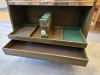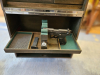 Pistolenkoffer aus Holz zum Aufklappen mit Zusatzfach. In der Bauart ähnlich wie die berühmten Pachmayr-Koffer. Abschließbar mit Spektiv. Gut erhalten mit Gebrauchsspuren im Inneren. Bilder sind Bestandteil der Beschreibung und Auktion. Länge 450mm, Breite 200mm, Höhe 355mm, Gewicht 6,4 Kg. Da dies ein Privatverkauf ist ohne Garantie, Rücknahme, Gewährleistung etc.
