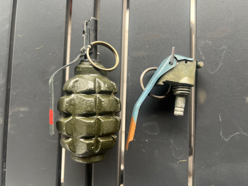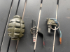 F1 Übungshandgranate, + zwei Zünder. ein Zünder kann problemlos reingeschraubt werden der andere passt nicht. Ob das zusammen gehört kann ich nicht sagen. Gewicht ohne Zünder 750g.