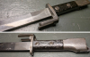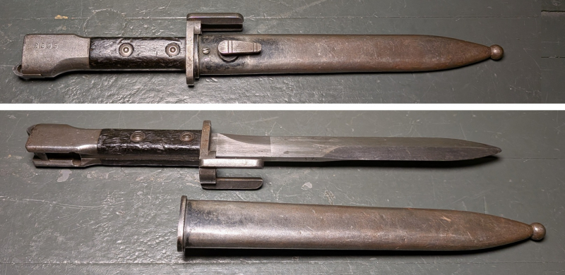 Das Bajonett kommt mit der typischen Scheide aus Stahlblech. Die Griffhälften sind aus geschwärztem Holz.