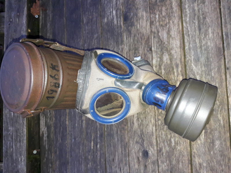 Originale Gasmaske M38 DAK ( bmw 1944 ) + Filter ( gnh FE41 - 09/1943 - WaA ) + Tornister ( frn 1943 - 1944 ) der Wehrmacht / Luftwaffe / Kriegsmarine , guter Zustand , Ufz. Otto Heinbach , 1986 K - Tornister & Gasmaske sind Nummerngleich .