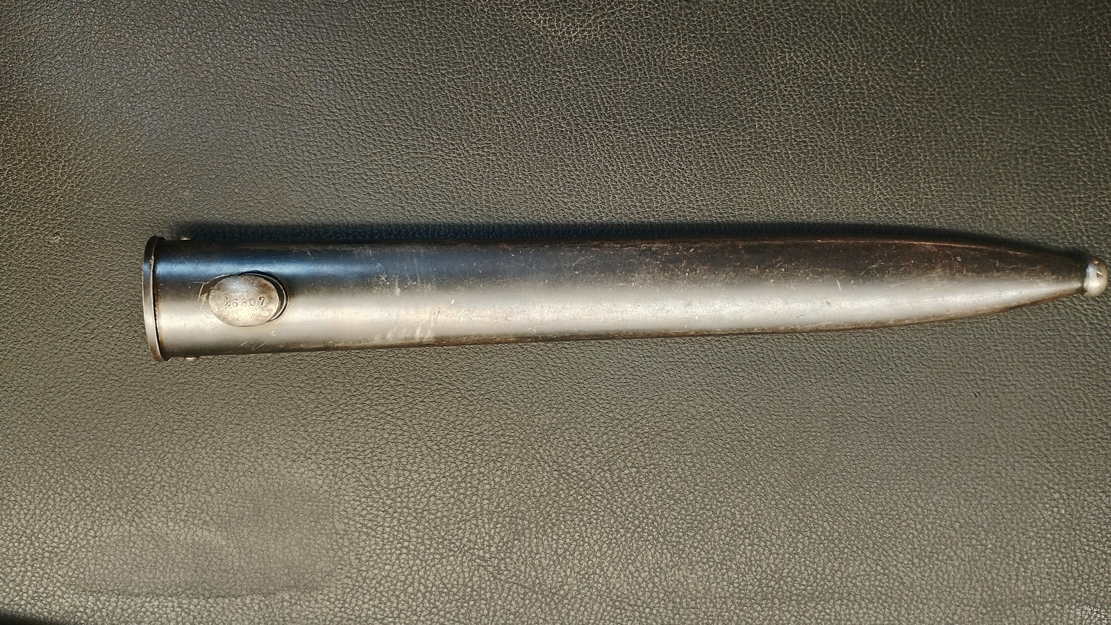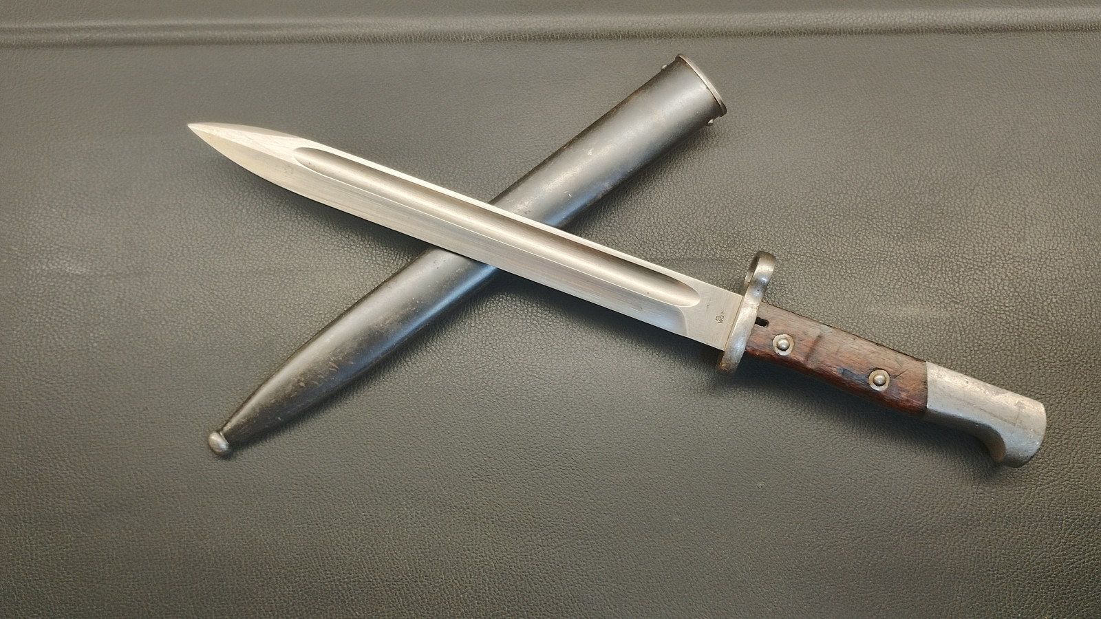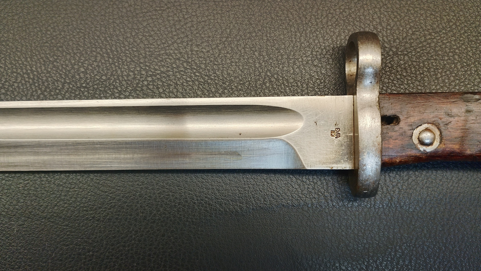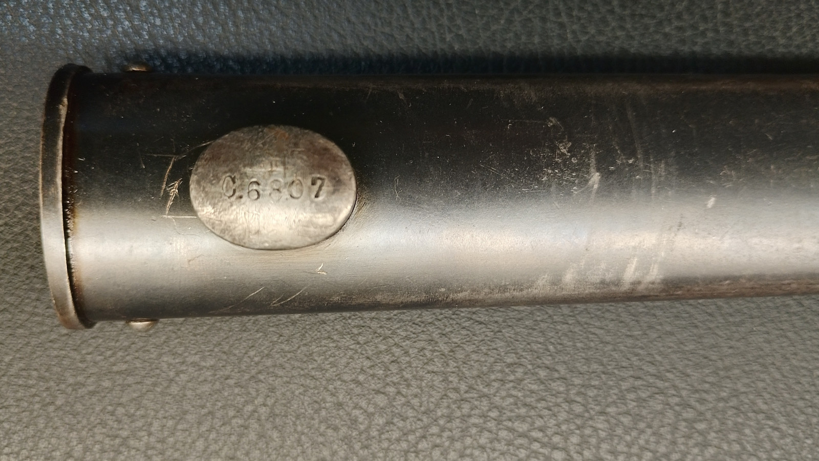 Verkaufe aus meiner Sammlung : Chile Bajonett Mauser 1912 ; Klingenspitze leicht nach rechts gebogen siehe Bilder ,Ich habe versucht es bestmöglich zu fotografieren ; Klingenlänge ca 25 cm ; Gesamtlänge ohne Scheide ca 38,5 cm ; Klinge mit OE WG . Erhaltungszustand ist Ansichtssache . Bitte schätzen Sie den Zustand des angebotenen Artikels anhand der Bilder selbst ein . Bilder sind Gegenstand der Auktion ,,,,,,,,,,,,,Viel Spass beim Bieten