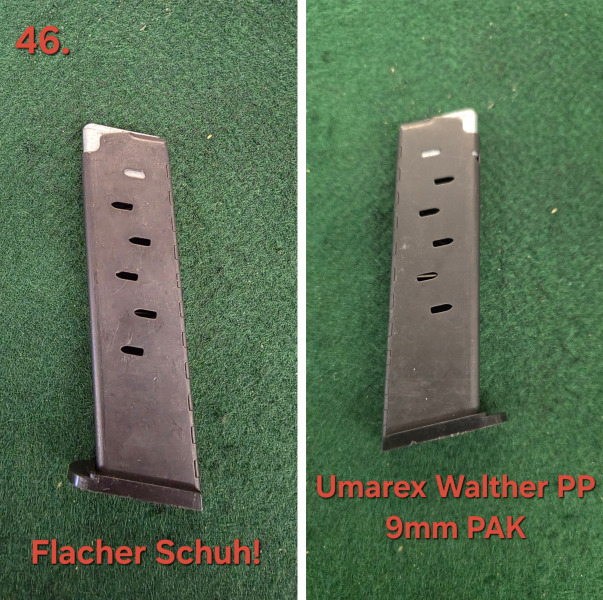 46.) Umarex Walther Mod. PP flacher Schuh Magazin Schreckschuss 9mm K. Knall PAK
