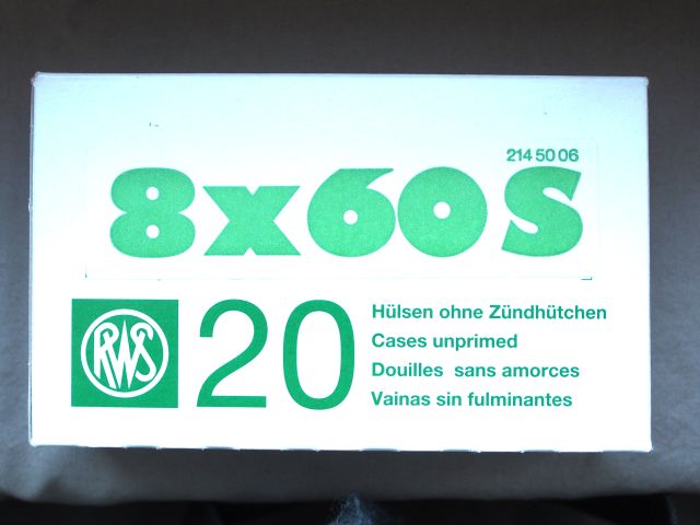 Biete eine Packung mit 20 Patronenhülsen für das Kaliber 8x60 S von der Fa. RWS. Die Hülsen sind ungebraucht und neuwertig.