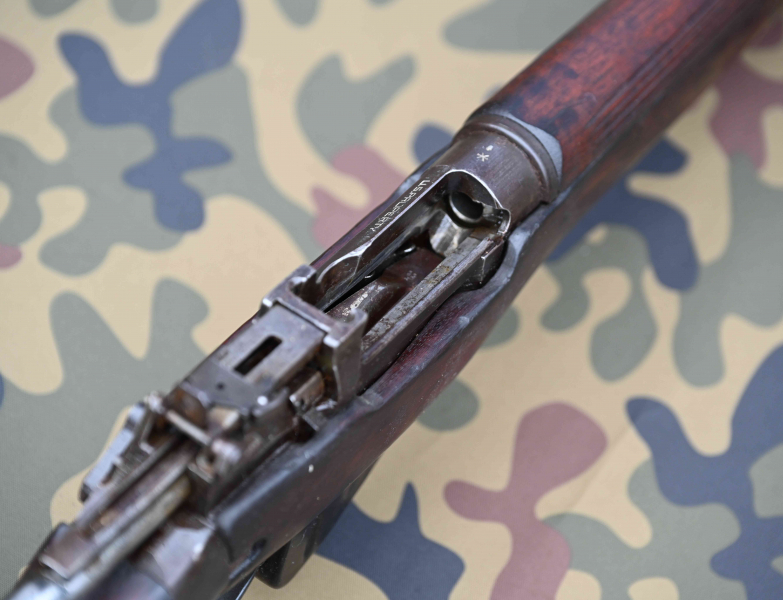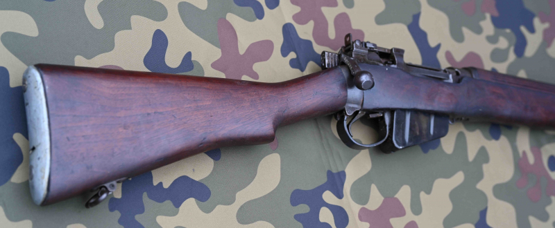 Diverse gültige britische Beschussstempel, Herstellerlogo „S“ und  Baujahr "1942" unterhalb der Modellbezeichnung "No. 4 Mk I" linksseitig auf der Hülse. Auf dem Schaftring links sowie auf dem Kammerstengel und auf der Magazinunterseite Seriennummer "9C6480". Eigentumsstempel "U.S.PROPERTY" auf der Hülse links, hinweisend auf das damalige  Lend-Lease-Projekt der Leihwaffen an England im Krieg.
