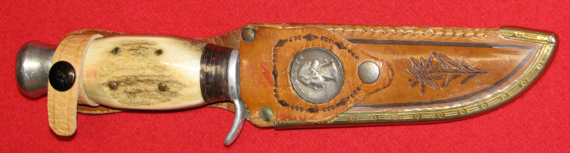 Zum Verkauf kommt ein Älteres Jagdmesser mit Münze in der Lederscheide