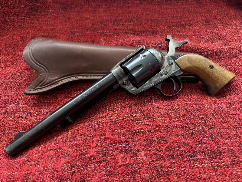 Gelegenheit aus großer Sammlungsauflösung!Viel schönes,seltenes dabei aus Westernbereich,Erma,Röhm ,HS,Derringer,Reck Lever Action .22-er Platz usw. wird demnächst eingestellt,bei Interesse einfach reinschauen und bei Fragen melden.Hier ein besonderes,fantastisches ,mächtiges Exemplar für den Sammler/Kenner/Liebhaber ,der nur das Beste und besondere haben möchte!Von dem Hersteller scharfer Schusswaffen - HS/Schmidt /Ostheim!Zuerst exakt so von HS in scharfen Varianten in den 70-er Jahren konzipiert und gebaut für härteste Ladungen im Cal. .357 Magnum und .44-er Magnum,dann ,als es noch möglich und erlaubt war,zu den guten,alten liberalen Zeiten,kam damals auch diese,freie PTB-Version auf den Markt,selbstverständlich mit allen qualitativen Eigenschaften des scharfen Modells,bis auf den scharfen Schuss versteht sich... nur minimal angepasst für die 9mm Patrone Knall&Gas,Beschussjahr 1983.Texas Scout Army 1873,Mod.121,gebaut für die Ewigkeit aus viel Stahl wie der scharfen Variante .Sehr gute Verarbeitung,wunderschöne Bunthärtung,Schloss 1A,seitliche Ladeklappe,alle Schriftzüge noch richtig schön eingeprägt und nicht einfach nur aufgelasert !Das hier ist ein frühes,seltenes Modell und wird so nicht mehr gebaut und angeboten!Gewinde für Pyrobecher ist vorhanden. Das Beste bzw. besondere : Der Lauf ist praktisch durchgehend frei und nur ganz hinten durch 2 dünne ,seitliche "Warzen" minimal verengt ,damit keine scharfen Geschossen den Lauf verlassen können,die Putzbürste geht,wie man sieht komplett durch.Daraus resultiert eine perfekte,abschreckende,"scharfe " Mündung,ideal im V-Fall,Homedefence usw..so wäre es heute aber leider absolut undenkbar wegen den verschärften PTB-Vorgaben! Viele Bastler konnten sich speziell bei diesen,stabilen,hochwertigen Modellen einfach nicht zurückhalten,sodass der Gesetzgeber verständlicherweise reagieren musste,so leider seit 40 Jahren nicht mehr in der Produktion,HS ist leider ebenfalls nicht mehr existent,Schade,nur Altbestand zählt also,was man hat,hat man !Lauf,Rahmen,Abzug,Hahn,Trommel usw. sind komplett aus Stahl!Gebaut für die Ewigkeit in dieser Güte und Qualität!Ein wahres ,absolutes mächtiges Exemplar so und definitiv das beste,was man sich heute noch zulegen kann-inclusive dem extra angefertigtem Lederholster!Einmalig so das ganze.Sammler und Kenner sind hier bestens beraten....Frei ab 18.Die Bilder als Beschreibung beachten.Von privat ab 1€ ohne Rücknahme.EU-Ausland Versandkosten 20€.