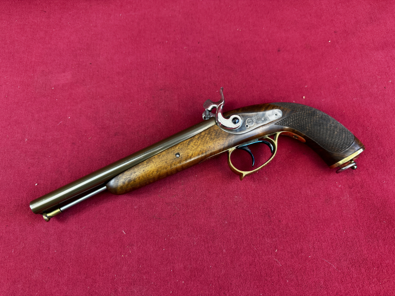 Es handelt sich hier um eine Armi Jaeger/ Jäger Corsair Doppelläufige Perkusions Pistole, in Luxus Ausführung (siehe Fotos) im Kaliber .44.