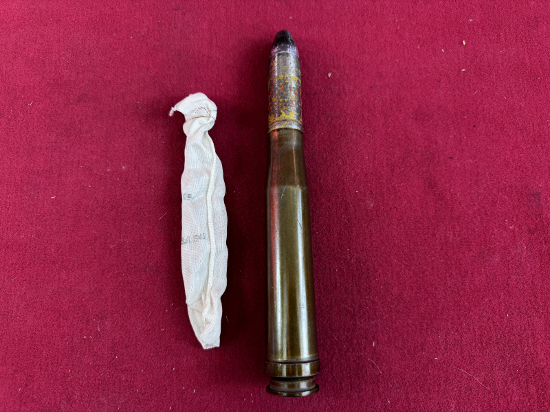 Es handelt sich hier um eine Hülse mit Geschoss und original Innenbeutel bedruckt mit Juli 1943 auf dem Hülsenboden sind folgende zeichen: Waa339, 41e, eey, 43 und ein Stern. Selbstverständlich befinden sich in der Hülse oder im Geschoss keinerlei gefährliche oder explosive Stoffe.