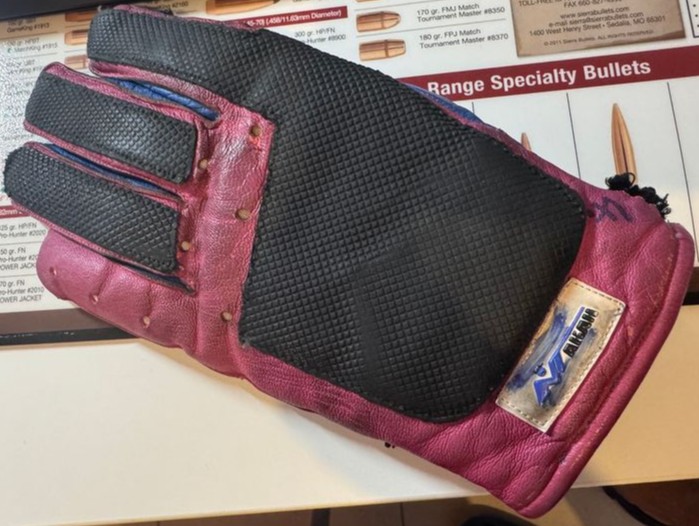 Der Handschuh wurde benutzt, ist jedoch voll funktionsfähig und bietet weiterhin guten Halt und Komfort beim Sportschießen.