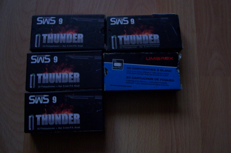 Biete 5 Schachteln 9mm P.A.K Knallpatronen. 1. blaue Schachtel Umarex gest. UMA 1 Schachtel SWS Thunder gest. UMA und 3 Schachteln SWS Thunder gest. Pobjeda diese haben richtig Rums und funktionieren so ziemlich in jeder Waffe. Insgesamt 250 Knallpatronen.