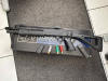 Der vordere Teile der Shotgun ist bis auf den Spannhebel an der Unterseite komplett aus stabilem Metall gefertigt. Außenlauf und auch das untere dekorative Laufsystem bestehen daher komplett aus detailliert gefertigtem Aluminium und sind mit einer schwarzen Beschichtung versehen. Auffällig ist auch der Flash-Hider im besonders aggressiven Design. Dank der Lizenzierung befinden sich auf der Abdeckung über dem Außenlauf originalgetreue, eingelaserte Fabarm-Markings. Oben ist eine durchgehende 21 mm Zielgerätschiene angebracht. Diese ist im vorderen Bereich mit einer Fiber-Optik Visierung ausgestattet, die wahlweise auch abgenommen werden kann. Im unteren Bereich befindet sich der taktische Spannhebel bzw. Spanngriff, welcher aus robustem Polymer-Verbundkunststoff gefertigt ist. Durch die ergonomische Formgebung mit eingearbeiteten Rillen und Strukturierungen ist für einen sehr guten Halt gesorgt. Unten am Spanngriff befindet sich zusätzlich noch eine praktische 21 mm Schiene. Das komplette Frontsystem kommt natürlich in der bekannten und besonders präzisen VFC Fertigungsqualität.