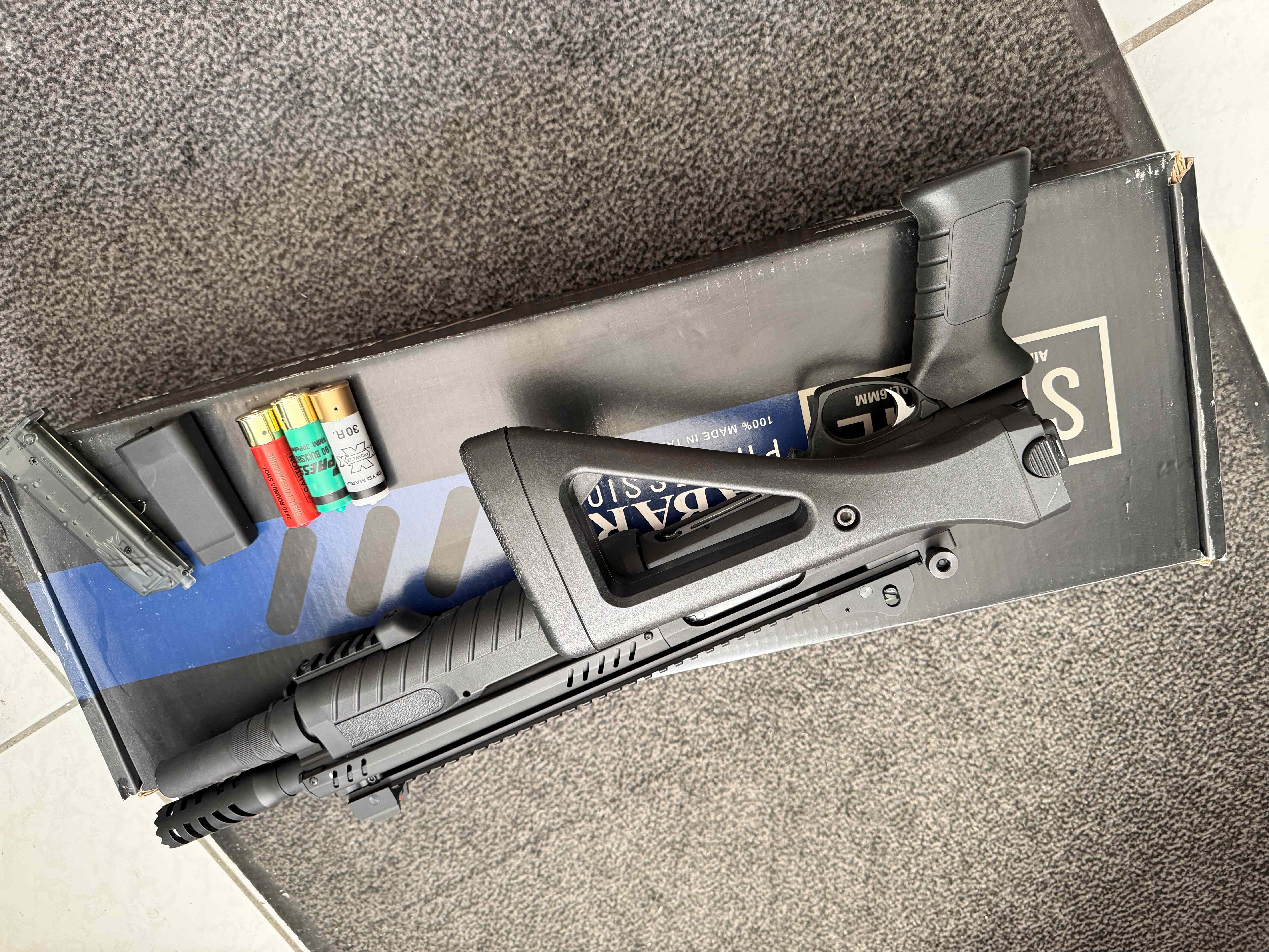Der Polymer-Verbundkunststoff Schaft ist mit einer Schaftkappe aus Gummimaterial versehen. Diese ist auch originalgetreu mit einem Fabarm Schriftzug und Logo versehen. Weiterhin kann der Schaft seitlich nach rechts eingeklappt werden. Die Shotgun wird dadurch besonders handlich und kann auch in Airsoft-CQB-Arealen perfekt geführt werden.