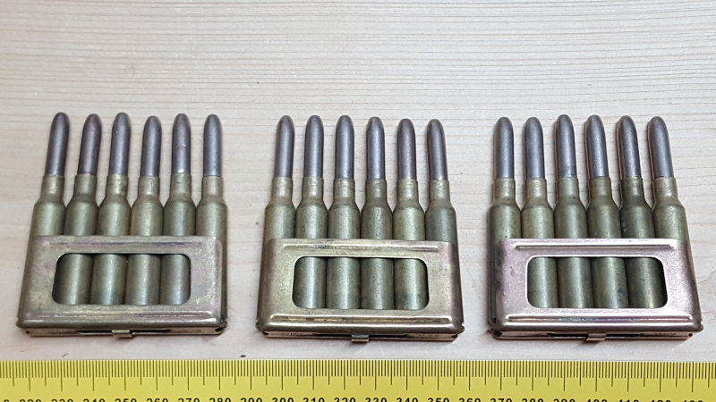 Sammlermunition: 18 Dekopatronen 6,5mm Carcano auf 3 Ladestreifen.