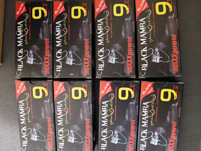 Zum Verkauf stehen 8 Päckchen 9mm P.A.K Black Mambra Maxx Power Patronen. Siehe Bild. Bitte senden sie mir nach der Auktion ihren Altersnachweis zu.