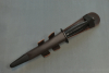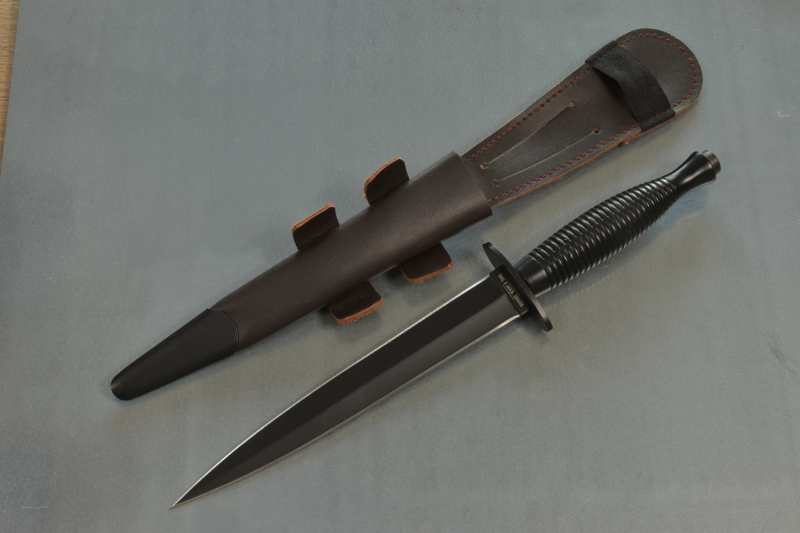Die schwarz beschichtete Klinge besteht aus rostfreiem 420er Stahl und ist ab Werk scharf geschliffen – das ist ein Unterschied zu den anderen, meist stumpfen, FS-Repliken. Mit dem Böker-Modell lässt sich sogar etwas schneiden. Der Griff ist aus, ebenfalls schwarz beschichtetem, Aluminium, die Scheide besteht aus Leder.