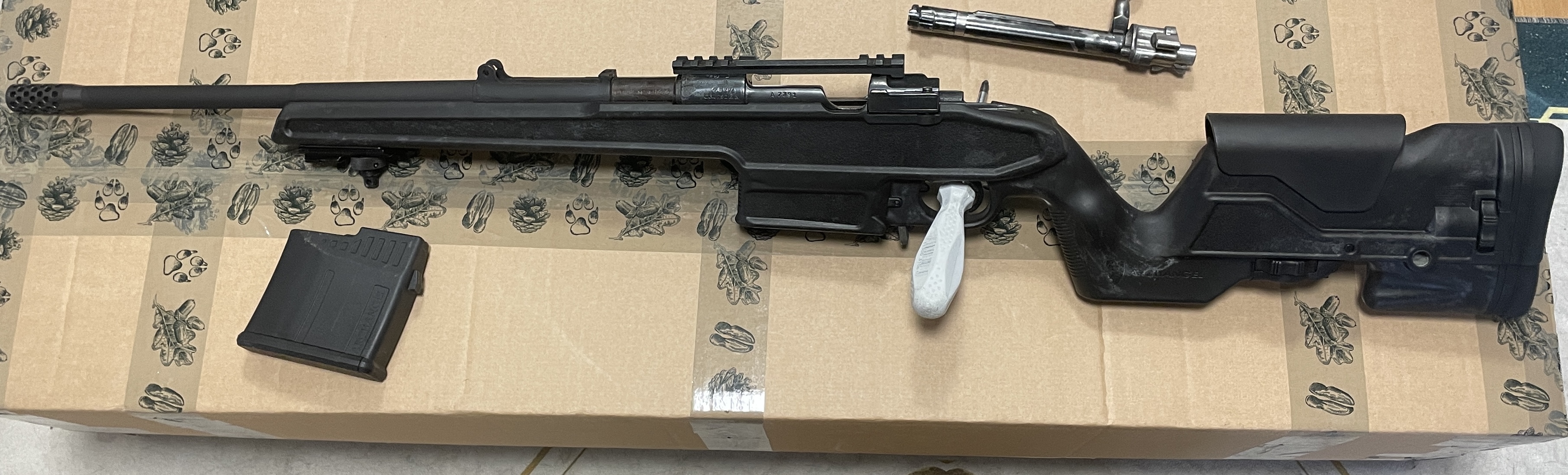 Der Lauf wurde gekürzt und ein 14x1 Gewinde wurde geschnitten. Die Picatinnyschiene ist montiert worden. Die Arbeiten sind beim Büchsenmeister (Sportwaffen Knörr) durchgeführt worden. Dort wurde auch der Neubeschuss der Büchse druchgeführt (der Verantwortliche war ziemlich begeistert!). Aktuell ist ein Signaturdämpfer von der Waffenschmiede Kühn und eine Zweibeinmontage von UTG monitert.