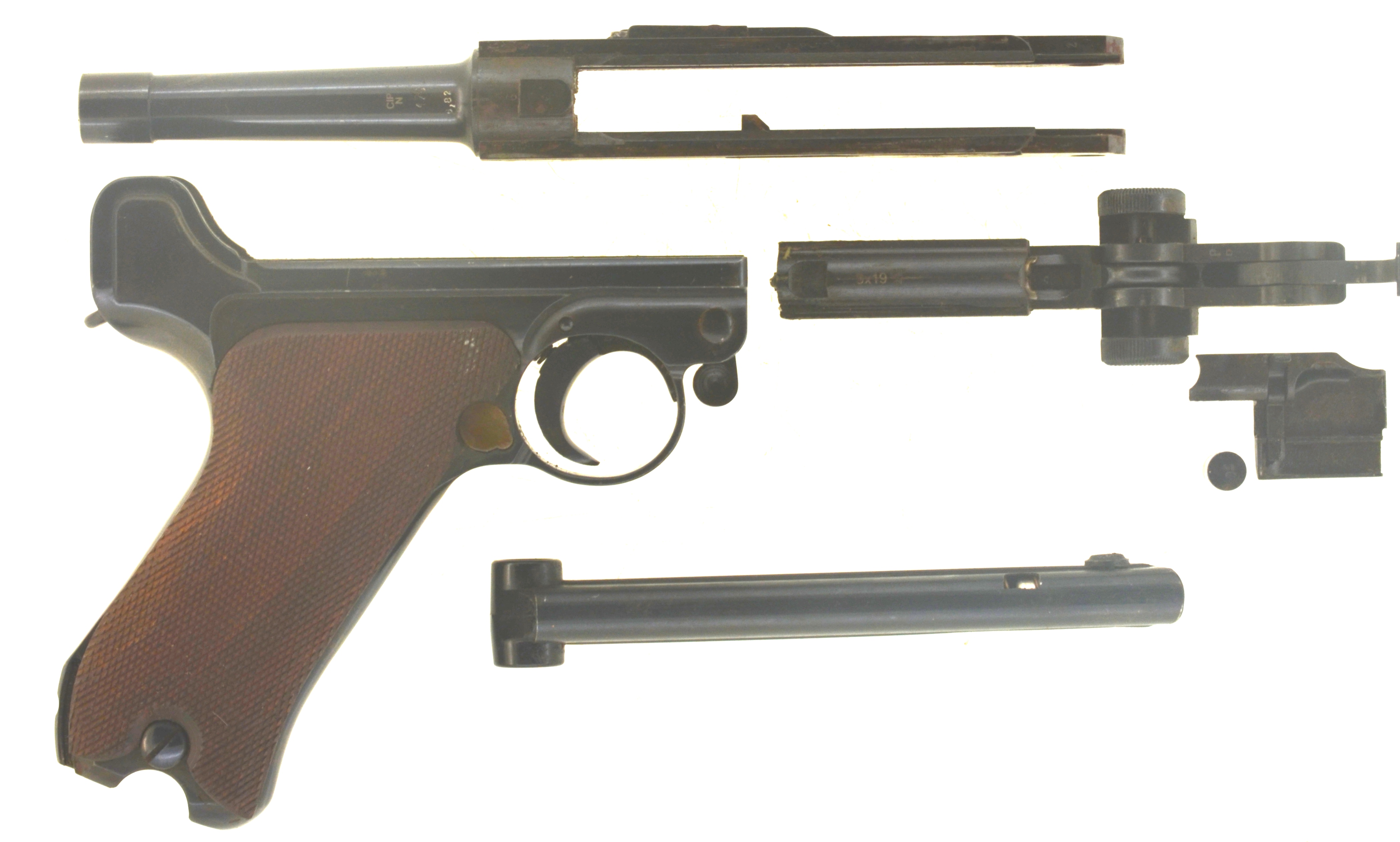 Auf der Kniegelenkoberseite Herstellercode "S/42", Seriennummer "5426 l" auf der Kopfseite des Griffstücks; oberhalb des Patronenlagers nur noch ganz schwach Buchstabe "G" erkennbar, kein Baujahr also. Herstellercode „S/42“, diverse Prüfstempel "W154" und "92" sowie ein Adler auf Laufgabel rechts. Kaliberhinweis "8,82", Seriennummer "426" sowie neues Beschusszeichen "CIP" auf der Laufunterseite an der Wurzel. Weitere neue bundesrepublikanische Beschusszeichen, datiert "25" auf dem Rahmen links, nur erkennbar bei demontierter Abedeckplatte. Auf allen Teilen (außer dem neuzeitlichen nummernlosen Magazin) Seriennummer 5426 bzw. hauptsächlich nur deren Endziffern "26". Kaliberangabe "9x19" und "CIP" über N auf der Patronenlagerunterseite, ebenfalls nur bei demontierter Waffe sichtbar.