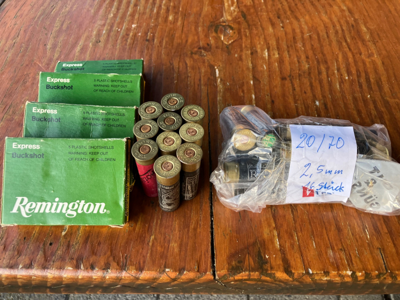 Zum Verkauf kommen 16 Patronen 20/70 Nr. 7, 2,5mm, 19 Patronen Remmington Buckshot und 10 Patronen Flintenlaufgeschosse.