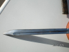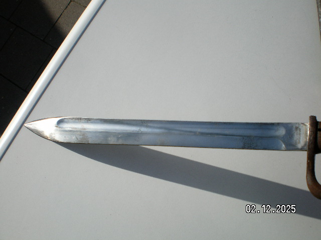 Angeboten wird ein Bajonett Seitengewehr 98/05 komplett mit Scheide 1. Weltkrieg. Länge gesamt ca. 52 cm. Zahlreiche Stempel, Marken und Prägungen. Auf der einen Klingenseite der Schriftzug Fichtel & Sachs Schweinfurt, auf dem Handschutzbügel die Prägung der Zahl 1009 deutlich zu sehen. Am Klingenrücken ein K, darüber eine Krone, es folgen die Zahl 17, dann kommt ein Buchstabe ähnlich dem des Englischen Pfund Sterling, dann folgt wieder eine Krone. Am Scheideneingang links wieder das K und darüber die Krone, rechts ein vermutliches F mit einem kleinen Fußhaken links unten, und ebenfalls eine Krone darüber. Das Bajonett befindet sich in Urzustand wie es vererbt wurde, es wurde nichts daran gemacht, weder an der Klinge, noch an dem Rost der Scheide. Die Klinge ist blank und der Stahl glänzt schön, ein paar dunklere Stellen befinden sich drauf, aber kein Rost.