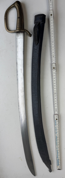 Säbel Briquet Frankreich, mit beschädigter Scheide, Messinggefäss mehrfach gestempelt. Gesamt-Länge ca. 74cm., Klingen-Breite: ca. bis zu 34mm., mit leichten Altersspuren, gebrauchtes Stück.