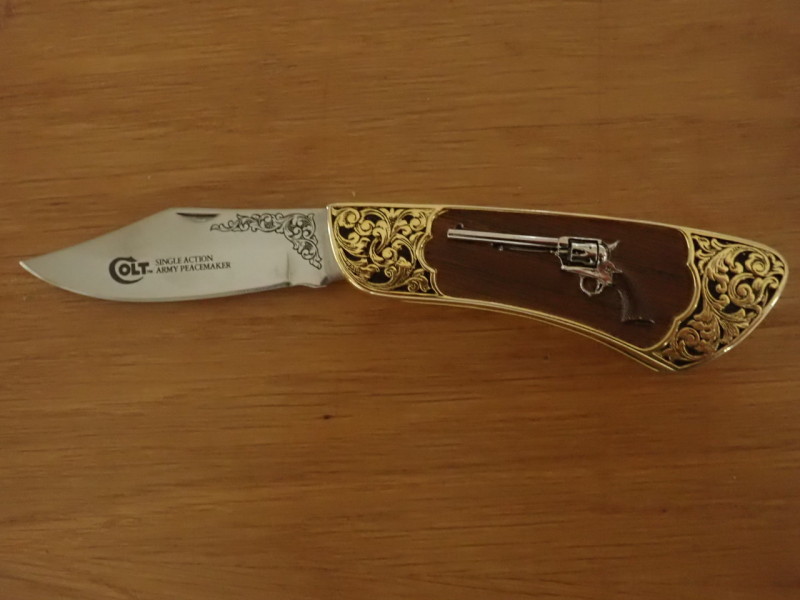 Versteigere hier ein Colt Sammlermesser. Es stammt aus der Franklin Mint Collection. Aktuell in Deutschland nicht mehr erhältlich. Es ist in einem absolut neuem neuwertigem Zustand. Keinerlei Abnutzungen, und oder Krazer. Klinge ist sehr scharf. Öffnet und schließt sich sehr sauber und absolut Wackelfrei, hat aber keine interne Klingenariettierung. Wurde nie aktiv benutzt. Die Verzierungen und der Rahmen sind Goldbeschichtet. Klingenlänge 7 cm, Grifflänge 10,5 cm. Gewicht 196 Gramm. Achtung und Hinweis hierzu. Dies ist eine Privatauktion. Deshalb hier keine Garantie, Gewährleistung, Rücknahme, Umtausch, Wandlung. Ich versende nur innerhalb Deutschlands, nicht EU weit, und auch nicht International. Das Colt Messer kann auch bei mir persönlich abgeholt werden nach Tel. Absprache, wenn es ein Geschenk werden sollte.