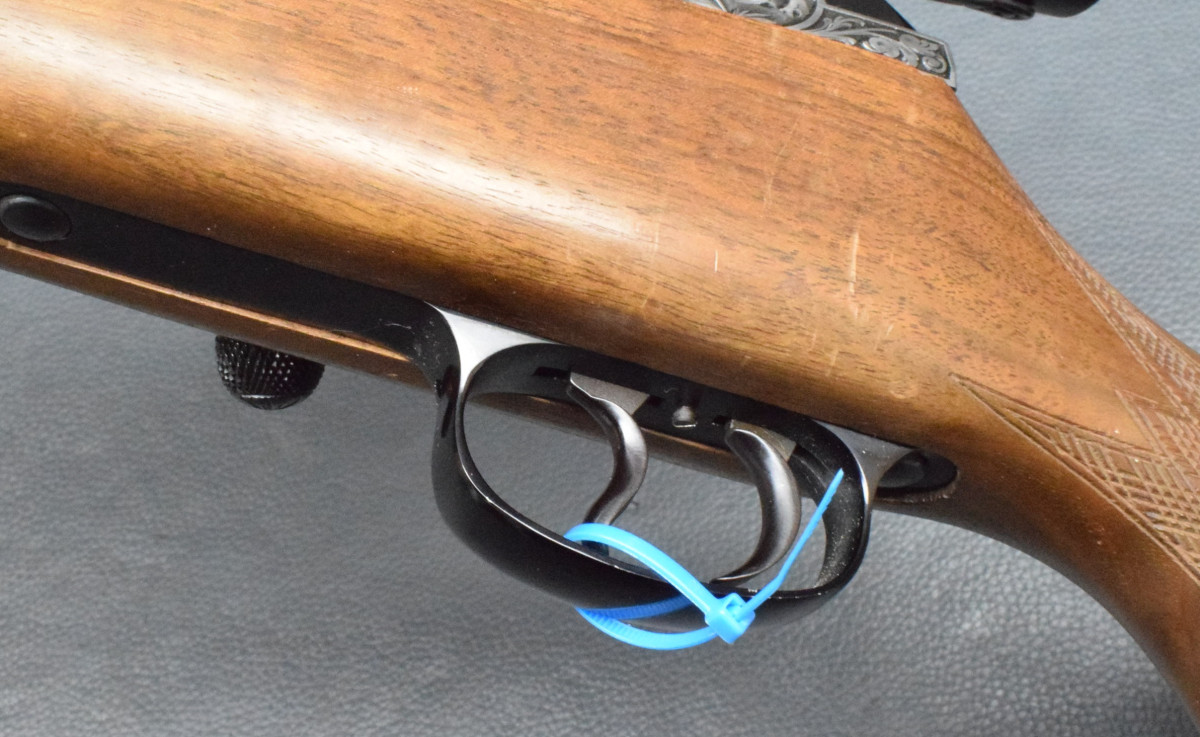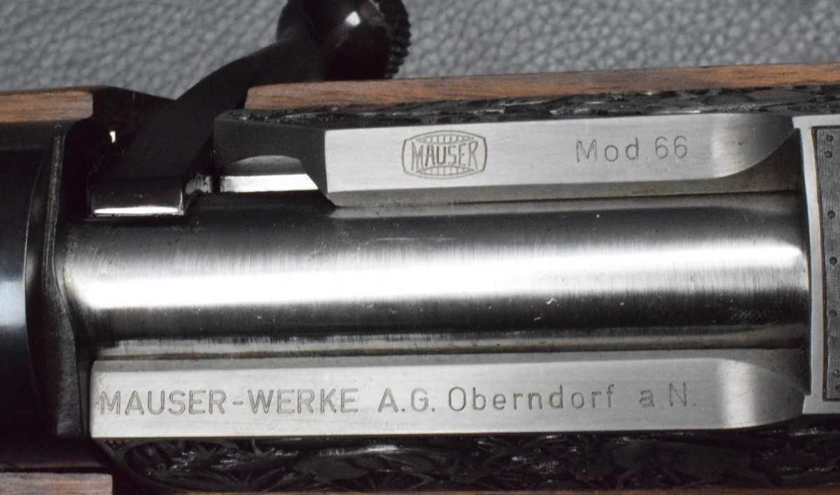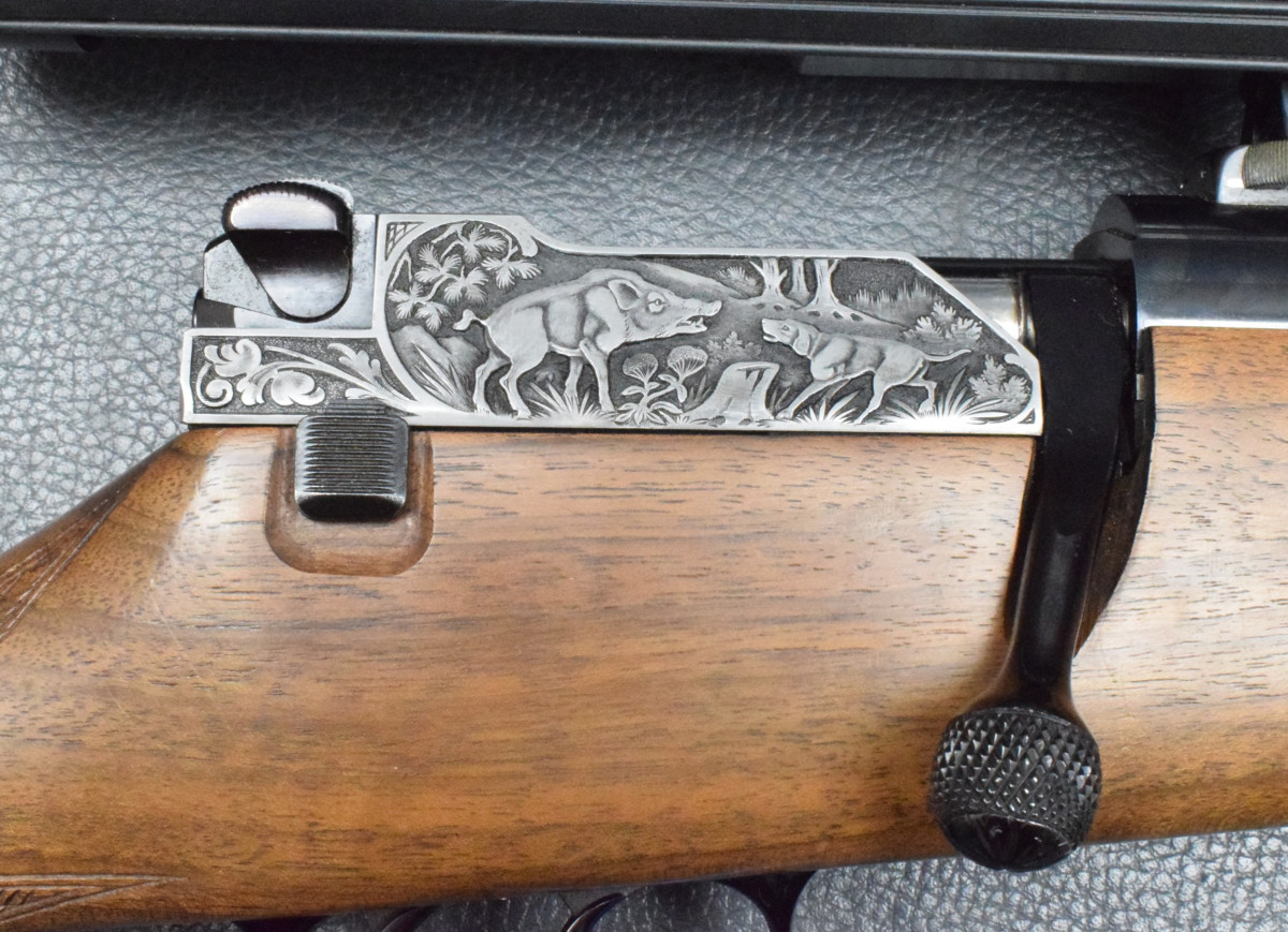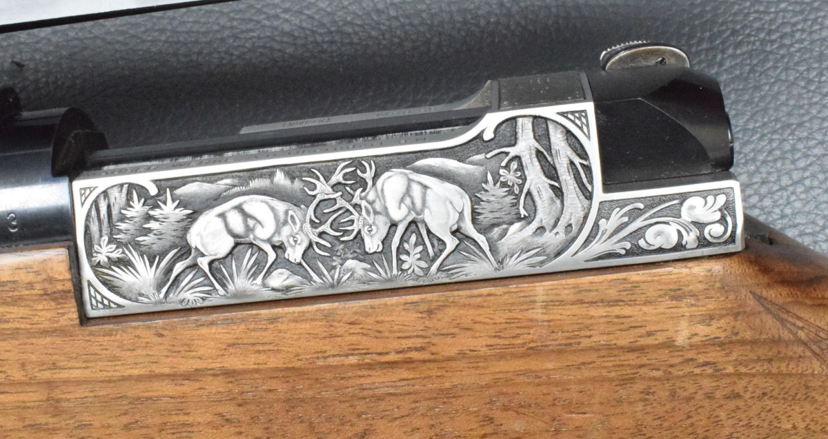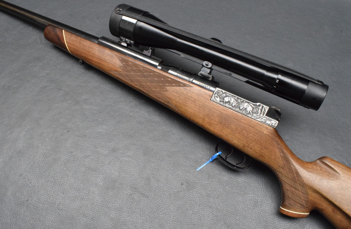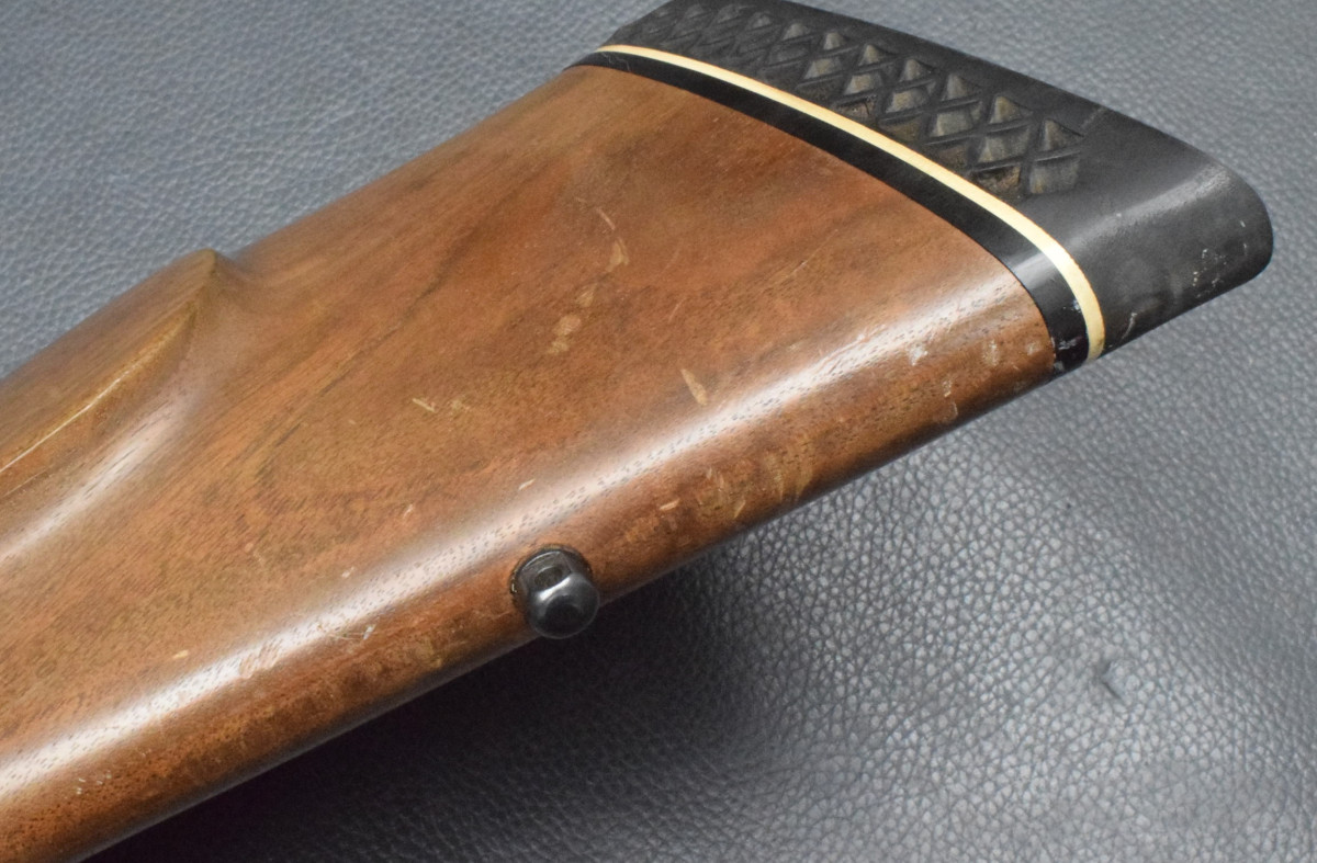 Nußbaumschaft mit deutscher Backe, Edelholzabschlüssen, Gummischaftkappe und Riemenbügeln.