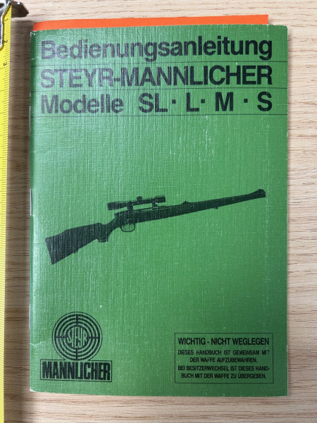 Seltene Bedienungsanleitung aus den 1990ern für Repetierbüchsen Steyr Mannlicher Mod. SL - L - M - S ("Makrolon"-Modelle mit Kunststoff-Trommelmagazin, System baugleich auch mit SSG69).