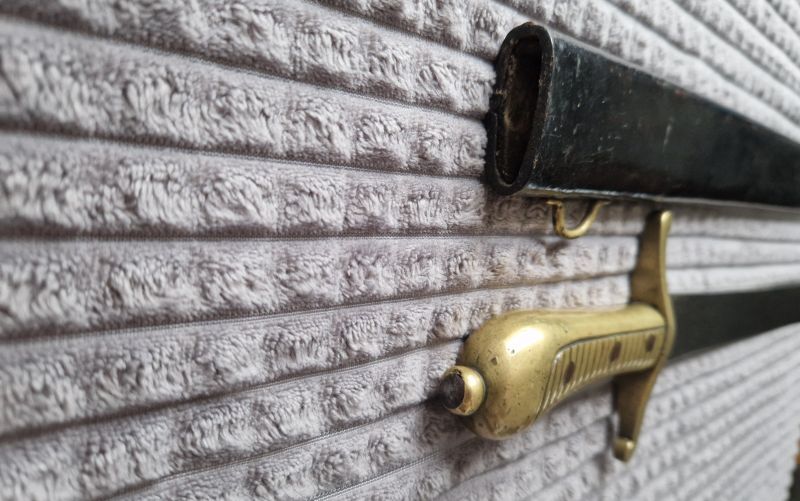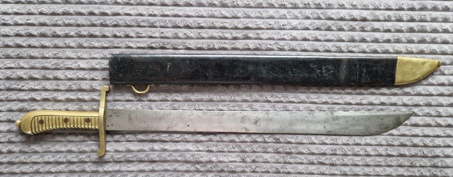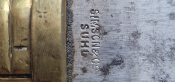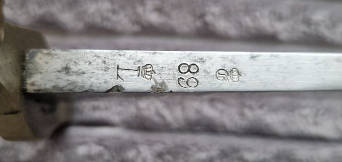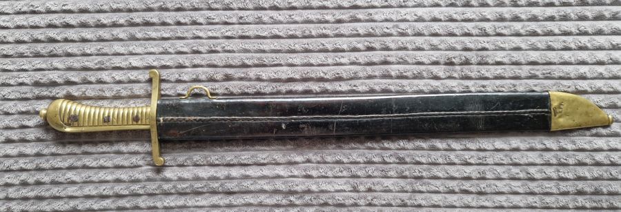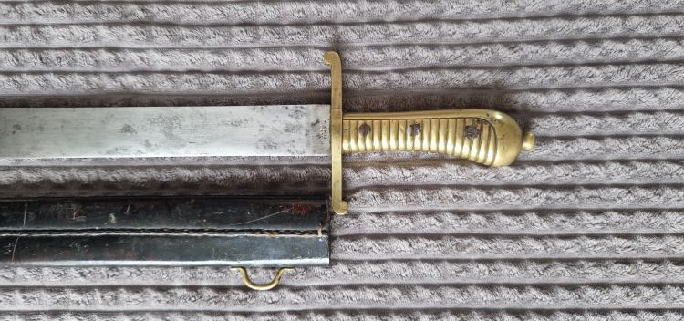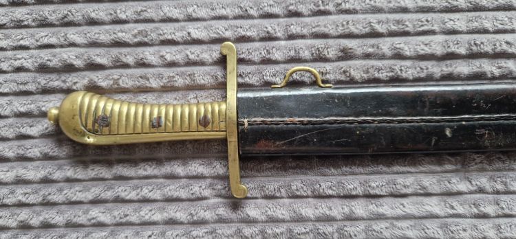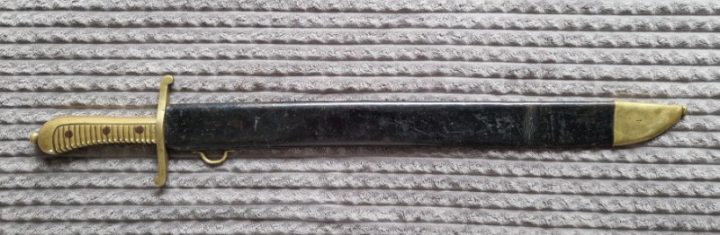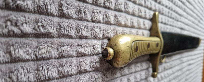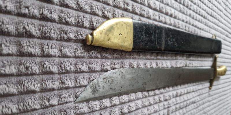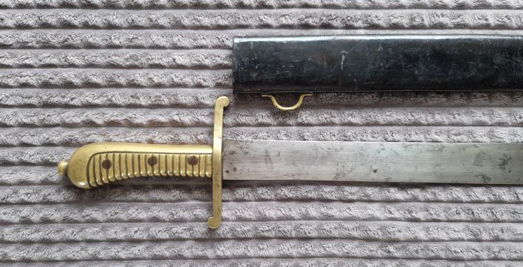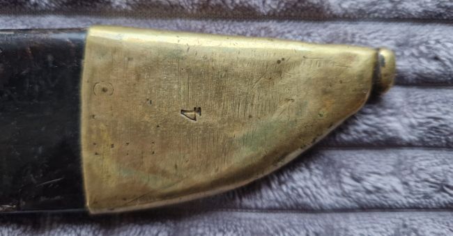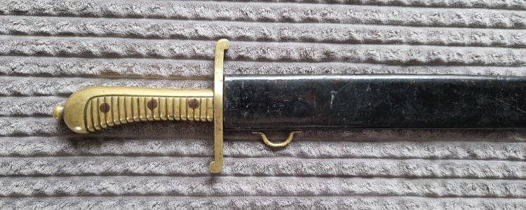 Parierelement und Griff in Messing (schlankerer Griff). Griff quer geriffelt, dreifach vernietet. Hoher Vernietknopf. Originale Vernietung.