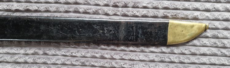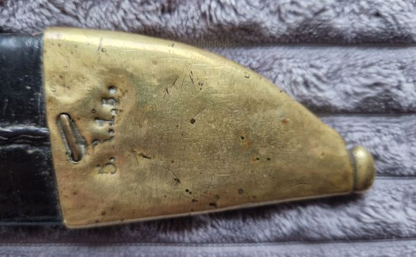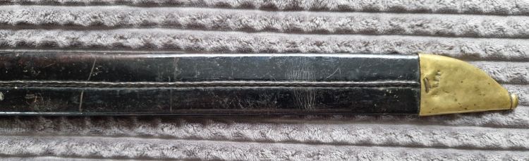 Gut erhaltene Lederscheide. Geschlossene Naht. Seitliche Anhängung. Ortblech geklammert sowie beidseitige Stempelung.