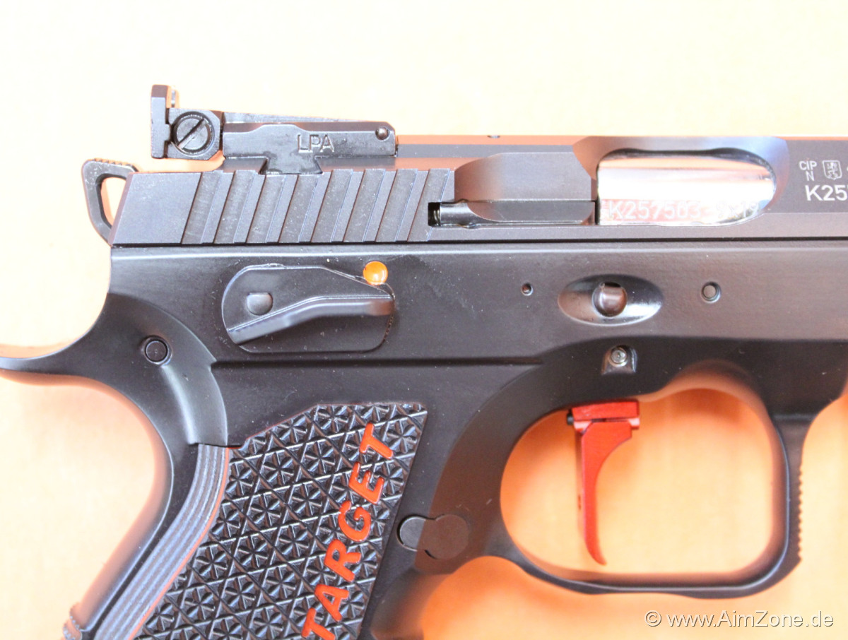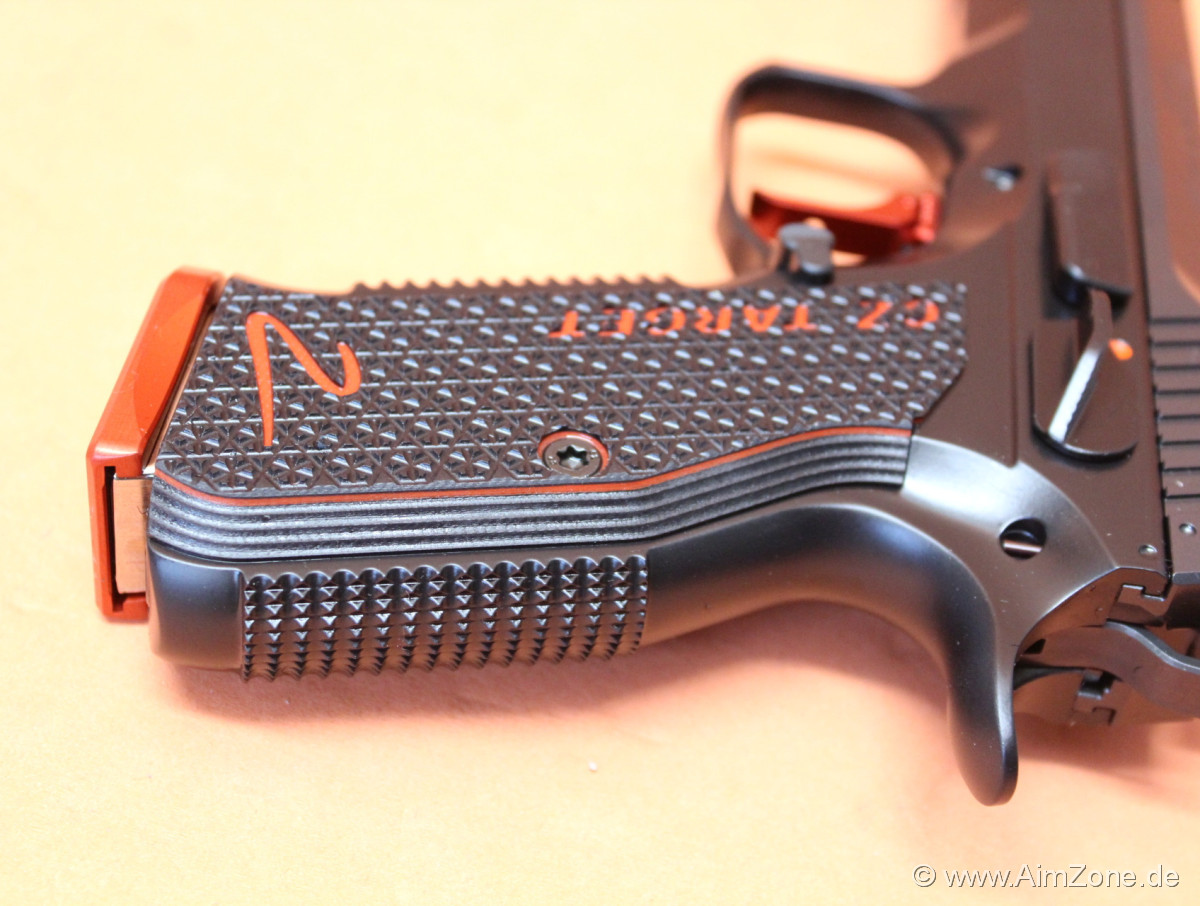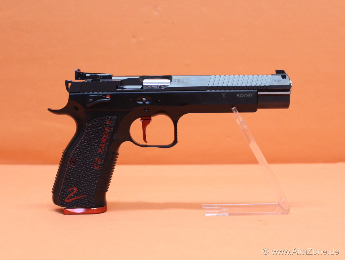 System CZ 75, 153mm Lauf, Sportkorn, LPA-Mikrometervisierung, Griffstück mit langem Dustcover (OHNE Zubehörschiene), vergrößerter Schlittenfanghebel, beidseitiger vergrößerter Sicherungshebel, einstellbarer SA Abzug (ca. 5 - 20N/ Auslieferzustand ca. 10N) mit einstellbarem Triggerstop/ Züngelposition (OHNE Schlagbolzensicherung), schwarz/rote G10-Griffschalen, 17-Schuß Magazin. Incl. 2 Stück Reservemagazine/ Reinigungsset/ Ersatzpuffer/ Ersatzkorn. Textilkoffer als Transportverpackung.