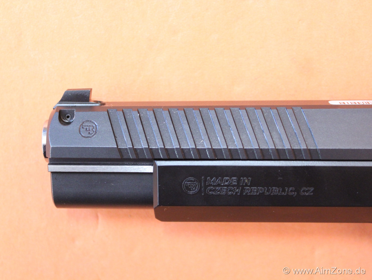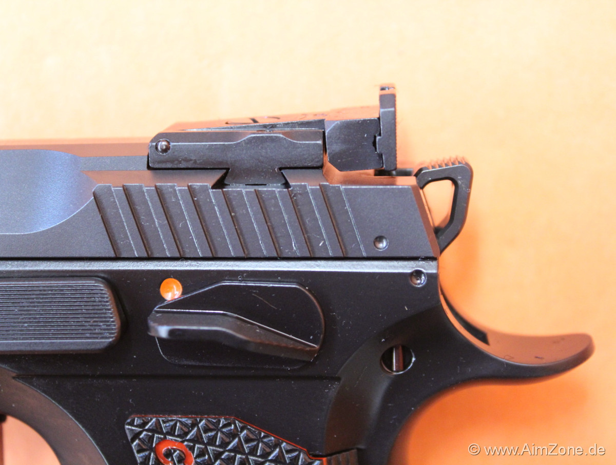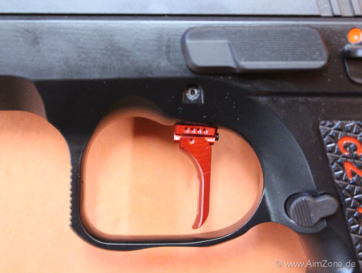System CZ 75, 153mm Lauf, Sportkorn, LPA-Mikrometervisierung, Griffstück mit langem Dustcover (OHNE Zubehörschiene), vergrößerter Schlittenfanghebel, beidseitiger vergrößerter Sicherungshebel, einstellbarer SA Abzug (ca. 5 - 20N/ Auslieferzustand ca. 10N) mit einstellbarem Triggerstop/ Züngelposition (OHNE Schlagbolzensicherung), schwarz/rote G10-Griffschalen, 17-Schuß Magazin. Incl. 2 Stück Reservemagazine/ Reinigungsset/ Ersatzpuffer/ Ersatzkorn. Textilkoffer als Transportverpackung.