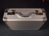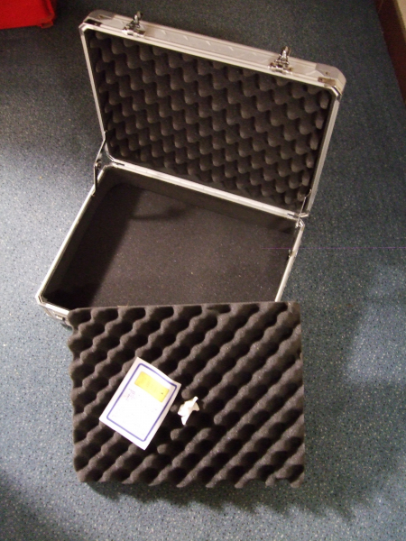 Der Alukoffer ist zweilagig und hat ein Außenmaß von ca. 42 cm X ca. 36 cm X ca. 15,5 cm, siehe Bilder.