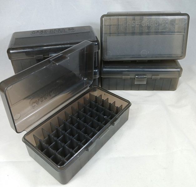 5 Stk MTM Case Guard Patronenboxen mit Klappdeckel, gebraucht, Farbe Rauch, Gr. Large Pistol Kal 44 Mag,/Kal 45