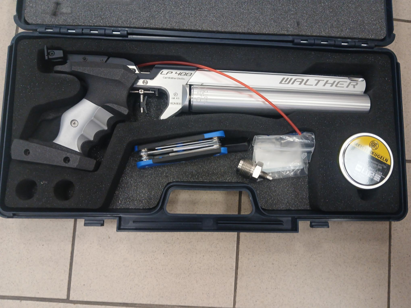 Walther LP 400 Match-Luftpistole im Kaliber 4,5mm. Die Waffe ist Baujahr 07/2017. Die Kartusche ist noch bis Juli 2027 zu nutzen. Die Waffe wurde wenig genutzt, da der Vorbesitzer nie so recht damit zurecht gekommen ist. Zusätzlich wurde die Waffe kürzlich bei Walther Generalüberholt. Der Griff ist ein rechter M-Griff. Die Lauflänge beträgt ca. 23cm.