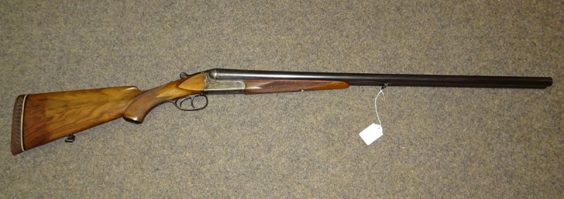 gepflegte, kaum benutzte Doppelflinte von SIMSON (Suhl), Modell "35/70E", mit gravierter Stahlbasküle, Kal. 12/70 (kein Stahlschrotbeschuss). Ejektor = die abgeschossene Hülse wird mit Schwung ausgestoßen. Da man Ejektorflinten nicht mit gezogenen Abzügen Zuklappen darf, sind 2 Pufferpatronen dabei. Damit lässt sich die Flinte mit entspannten Abzugsfedern in den Schrank stellen.