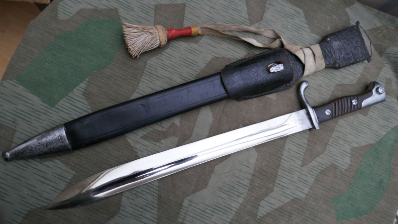 Sie bieten auf ein Preussisches EXTRA SEITENGEWEHR 98/05 alter Art mit Lederscheide,Lack-Koppelschuh und Troddel mit Hersteller in gutem Zustand.------