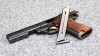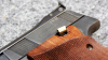 Griffstück: Anatomische Holzgriffschalen (oft mit Daumenauflage und Fischhaut) im "Military Style Grip" (ähnliche Handlage wie die M1911).