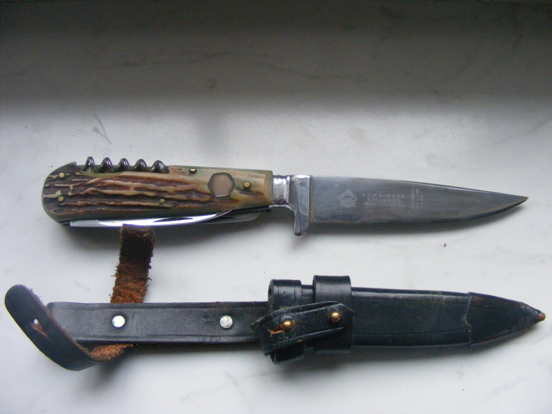 Gebe ein Jagdmesser der Fa. PUMA ab. Es hat eine feststehende Klinge, eine Aufbruchklinge, eine Säge und einen Korkenzieher. Auf der feststehenden Klinge steht „PUMA-WERK Solingen MADE IN GERMANY“, „Handarbeit Bestell-No 3591“ (sofern ich es richtig entziffert habe) und „Original Waidmesser für Schalenwild“. Griff aus echtem Hirschhorn. Gesamtlänge ca. 22,5 cm. Klingenlänger der feststehenden Klinge ca. 11,5 cm. Mit Lederscheide. Bei der Lederscheide fehlt eine Niete. Messer wurde nie benutzt, aber die Klinge beschliffen Der Verkauf erfolgt unter Ausschluss jeglicher Sachmängelhaftung.