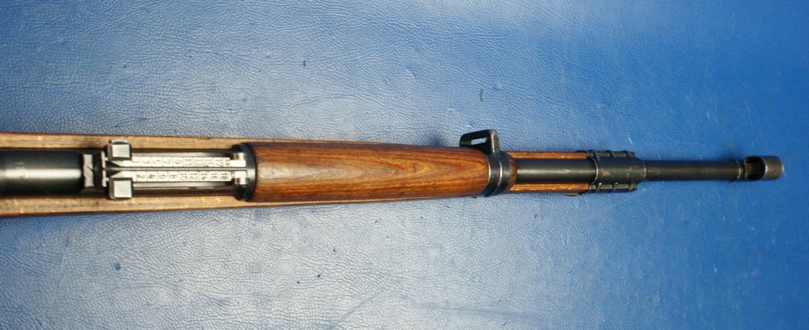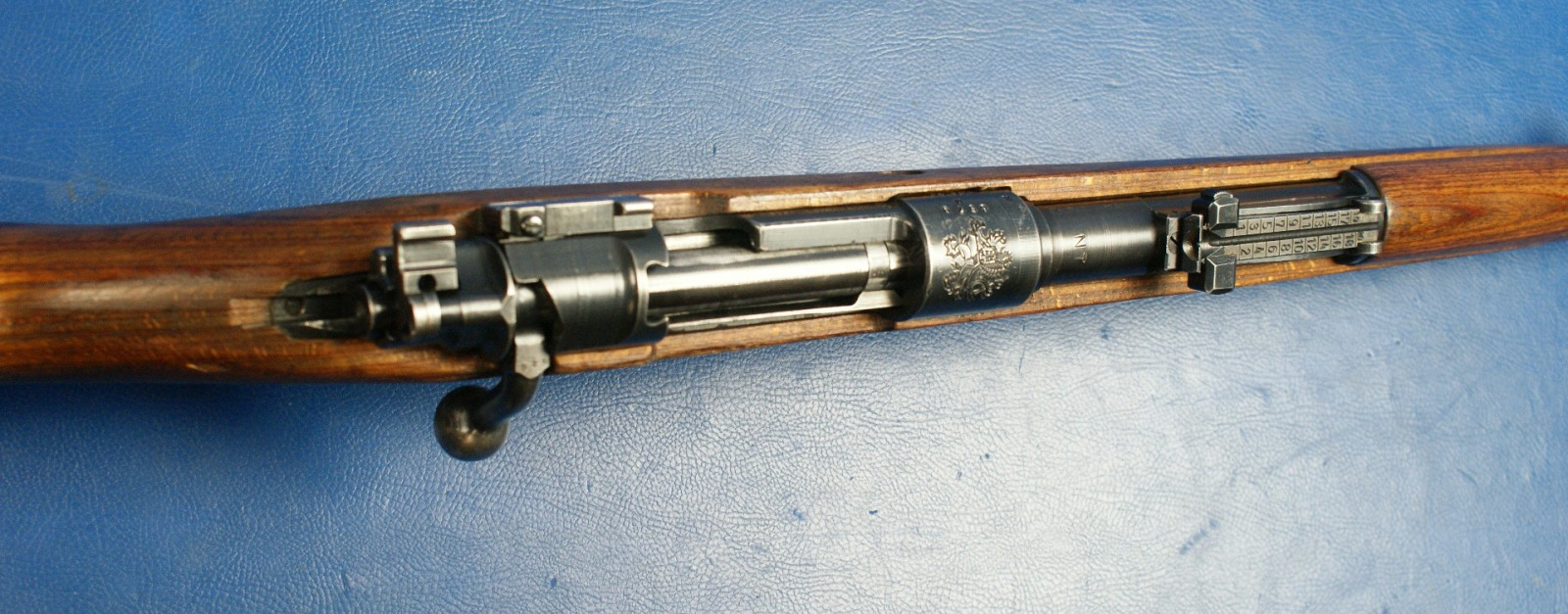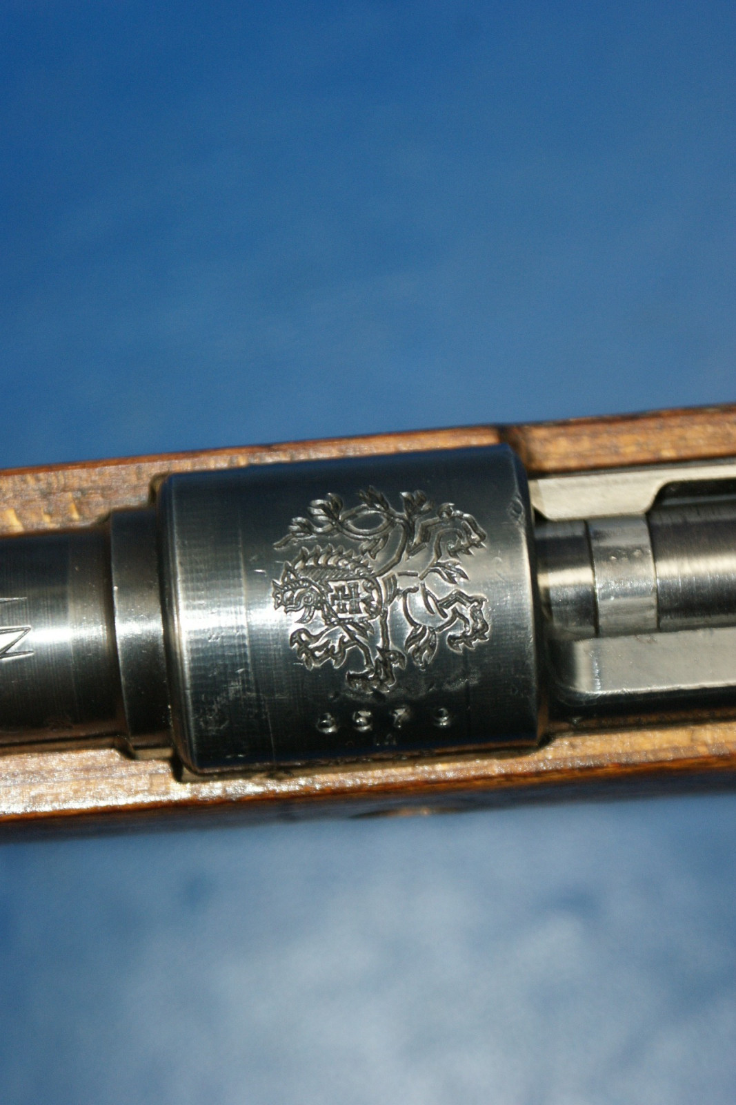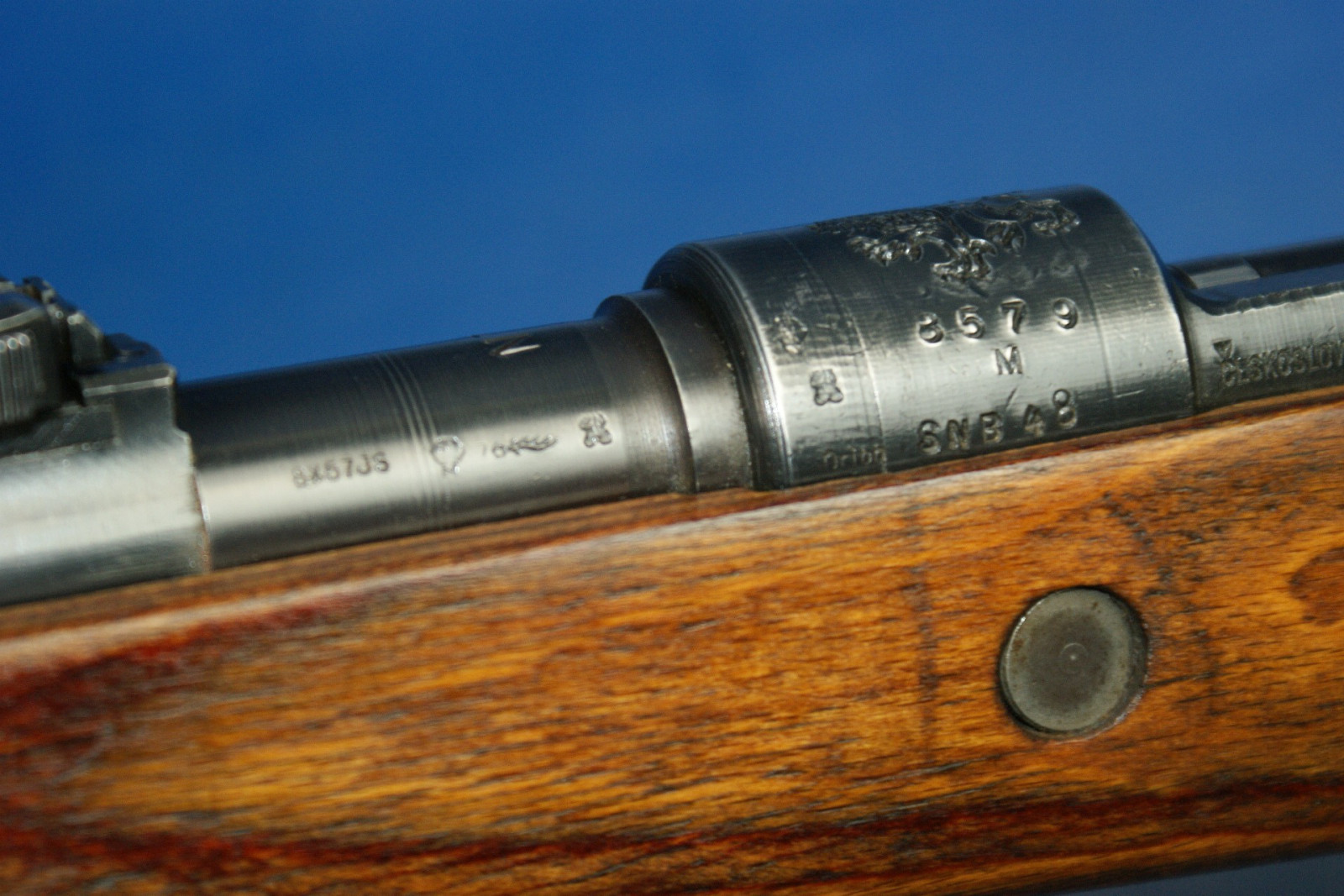 Die meisten tschechischen K98k-Gewehre der Nachkriegszeit, die für den Inlandsverbrauch bestimmt waren, wurden ohne deutsche Fabrikcodes gebaut, oder, falls ein codierter Verschluss verwendet wurde, wurden die Codes entfernt. Die Verschlussgehäuse wurden dann mit dem tschechischen Wappen „Stehender Löwe“ rollenmarkiert. Der wahrscheinlich größte frühe Käufer tschechischer K98k-Gewehre war der junge Staat Israel. Israel kaufte viele tausend neue und überholte deutsche K98k-Gewehre aus dem Zweiten Weltkrieg von den Tschechen. Sie sind mit originalen deutschen Markierungen aus dem Zweiten Weltkrieg, mit Dot- und Swp-Codes aus der Nachkriegszeit und gelegentlich mit dem Wappen mit dem aufgerichteten Löwen im Stil der Inlandsproduktion zu finden. Die meisten wurden später in den 1950er Jahren in Israel überholt und auf 7,62 Nato umgerüstet. Obwohl auch andere Länder große Mengen tschechisch produzierter K98k-Gewehre kauften, ist es sehr selten, diese Gewehre mit intakten Wappen mit dem aufgerichteten Löwen zu finden. Irgendwann nach den ersten Verkäufen an Israel scheinen die Tschechen beschlossen zu haben, Gewehre mit ihrem heimischen Löwenwappen nicht mehr an ausländische Kunden zu verkaufen. Später produzierte Gewehre werden mit den früheren Markierungen dot45 oder dem Produktionscode tgf gekennzeichnet. Als das tschechische Militär begann, die Ausgabe von K98k-Gewehren zugunsten halbautomatischer und feuergesteuerter Gewehre, nämlich VZ52 und VZ58, einzustellen, wurden diese weitgehend veralteten Mauser normalerweise leicht aufgearbeitet und die tschechischen Löwenwappen fein abgeschliffen, bevor sie neu brüniert wurden. Diese ehemaligen tschechischen Armeegewehre wurden anschließend an eine Reihe von Kundenländern verkauft. Dem Autor ist nicht bekannt, ob die Wappen abgeschliffen wurden, um den Verkauf zu erleichtern, oder ob die Wappen aus Prinzip entfernt wurden, während sie sich noch in tschechischen Lagerbeständen befanden. (Klicken Sie auf das Bild, um es zu vergrößern) Gewehre, die aufgearbeitet und anschließend aus dem Bestand der tschechischen Armee verkauft wurden, weisen im Allgemeinen neben der Seriennummer zusätzlich zu den normalerweise anzutreffenden Schussproben mit dem aufgerichteten Löwen den „gekreuzten Schwerter“-Beweis aus den 1950er-Jahren auf. Einige sehr späte, mit TGF codierte Gewehre, die ins Ausland verkauft wurden, weisen möglicherweise ebenfalls den „gekreuzten Schwerter“-Beweis auf, da allgemein angenommen wird, dass die Markierung etwa 1950 in Gebrauch kam. Typische Merkmale der tschechischen Nachkriegsproduktion sind: - Schussproben mit dem aufgerichteten Löwen. - Halbkriegsmodellschaft mit Verschlussdemontage in der gewölbten Schaftkappe. Schäfte sind am häufigsten mit einer Bajonetthalterung ausgestattet. - Oft werden Teile mit deutscher Markierung aus dem 2. Weltkrieg mit neuen Produktionsteilen vermischt gefunden. - Schäfte bestehen normalerweise aus laminierter Buche oder Walnuss. - Abzugsbügel bestehen normalerweise entweder aus recycelten deutschen Teilen oder aus einer nach dem Krieg geprägten Konstruktion mit vergrößertem Abzugsbügel. - Seriennummern haben Seriennummernsuffixe in Großbuchstaben. - Empfängerringe sind typischerweise: geschrubbt, mit dem Wappen eines steigenden Löwen versehen oder mit den Codes dot44, dot45, swp45 oder tgf50 versehen.