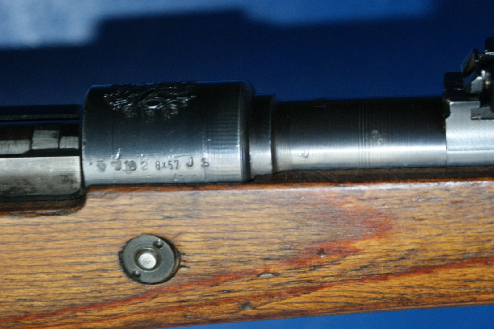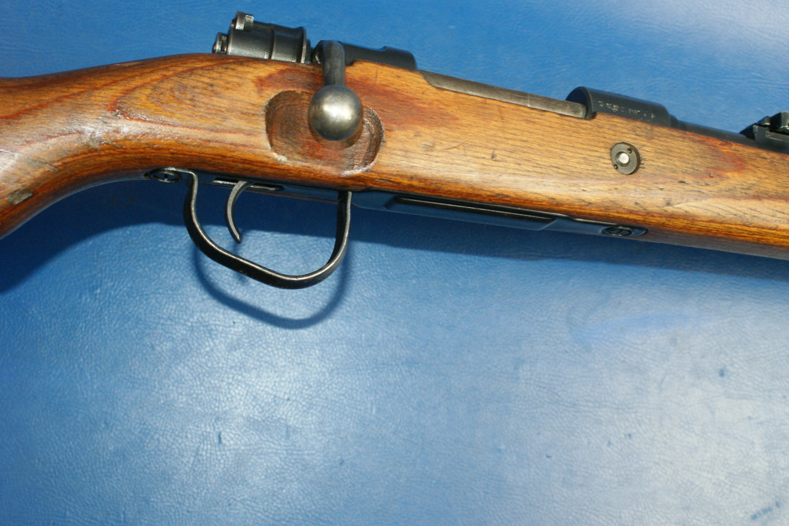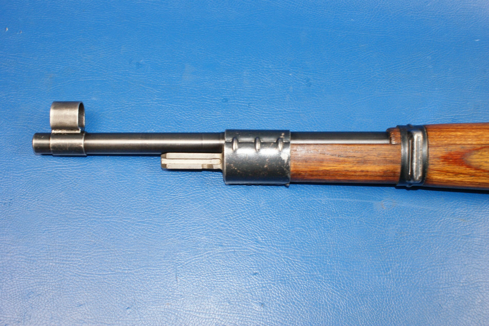 Die meisten tschechischen K98k-Gewehre der Nachkriegszeit, die für den Inlandsverbrauch bestimmt waren, wurden ohne deutsche Fabrikcodes gebaut, oder, falls ein codierter Verschluss verwendet wurde, wurden die Codes entfernt. Die Verschlussgehäuse wurden dann mit dem tschechischen Wappen „Stehender Löwe“ rollenmarkiert. Der wahrscheinlich größte frühe Käufer tschechischer K98k-Gewehre war der junge Staat Israel. Israel kaufte viele tausend neue und überholte deutsche K98k-Gewehre aus dem Zweiten Weltkrieg von den Tschechen. Sie sind mit originalen deutschen Markierungen aus dem Zweiten Weltkrieg, mit Dot- und Swp-Codes aus der Nachkriegszeit und gelegentlich mit dem Wappen mit dem aufgerichteten Löwen im Stil der Inlandsproduktion zu finden. Die meisten wurden später in den 1950er Jahren in Israel überholt und auf 7,62 Nato umgerüstet. Obwohl auch andere Länder große Mengen tschechisch produzierter K98k-Gewehre kauften, ist es sehr selten, diese Gewehre mit intakten Wappen mit dem aufgerichteten Löwen zu finden. Irgendwann nach den ersten Verkäufen an Israel scheinen die Tschechen beschlossen zu haben, Gewehre mit ihrem heimischen Löwenwappen nicht mehr an ausländische Kunden zu verkaufen. Später produzierte Gewehre werden mit den früheren Markierungen dot45 oder dem Produktionscode tgf gekennzeichnet. Als das tschechische Militär begann, die Ausgabe von K98k-Gewehren zugunsten halbautomatischer und feuergesteuerter Gewehre, nämlich VZ52 und VZ58, einzustellen, wurden diese weitgehend veralteten Mauser normalerweise leicht aufgearbeitet und die tschechischen Löwenwappen fein abgeschliffen, bevor sie neu brüniert wurden. Diese ehemaligen tschechischen Armeegewehre wurden anschließend an eine Reihe von Kundenländern verkauft. Dem Autor ist nicht bekannt, ob die Wappen abgeschliffen wurden, um den Verkauf zu erleichtern, oder ob die Wappen aus Prinzip entfernt wurden, während sie sich noch in tschechischen Lagerbeständen befanden. (Klicken Sie auf das Bild, um es zu vergrößern) Gewehre, die aufgearbeitet und anschließend aus dem Bestand der tschechischen Armee verkauft wurden, weisen im Allgemeinen neben der Seriennummer zusätzlich zu den normalerweise anzutreffenden Schussproben mit dem aufgerichteten Löwen den „gekreuzten Schwerter“-Beweis aus den 1950er-Jahren auf. Einige sehr späte, mit TGF codierte Gewehre, die ins Ausland verkauft wurden, weisen möglicherweise ebenfalls den „gekreuzten Schwerter“-Beweis auf, da allgemein angenommen wird, dass die Markierung etwa 1950 in Gebrauch kam. Typische Merkmale der tschechischen Nachkriegsproduktion sind: - Schussproben mit dem aufgerichteten Löwen. - Halbkriegsmodellschaft mit Verschlussdemontage in der gewölbten Schaftkappe. Schäfte sind am häufigsten mit einer Bajonetthalterung ausgestattet. - Oft werden Teile mit deutscher Markierung aus dem 2. Weltkrieg mit neuen Produktionsteilen vermischt gefunden. - Schäfte bestehen normalerweise aus laminierter Buche oder Walnuss. - Abzugsbügel bestehen normalerweise entweder aus recycelten deutschen Teilen oder aus einer nach dem Krieg geprägten Konstruktion mit vergrößertem Abzugsbügel. - Seriennummern haben Seriennummernsuffixe in Großbuchstaben. - Empfängerringe sind typischerweise: geschrubbt, mit dem Wappen eines steigenden Löwen versehen oder mit den Codes dot44, dot45, swp45 oder tgf50 versehen.