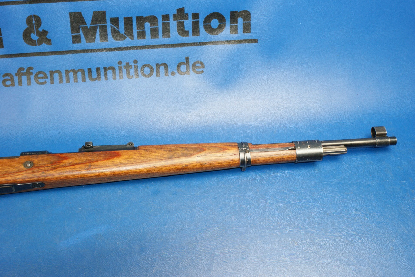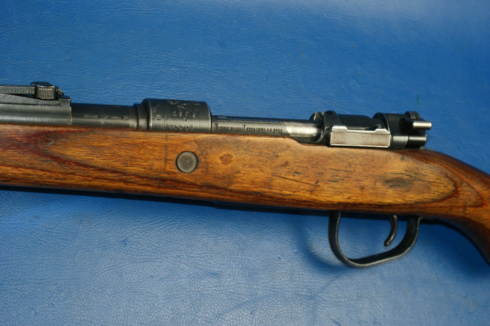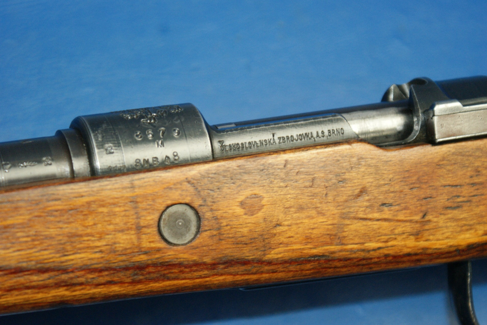 Hülsenkopf mit schreitenden Löwen, links "SNB 48", an der Führung Brünner Firmierung. Vollständige, originale Brünierung. Schichtholzschaft in Ausführung "Kriegsmodell" ohne Putzstock mit Winterabzugsbügel. Kornschutz. Fertigung teils aus noch vorhandenen Wehrmachtsteilen. Länge 110cm Vor dem Zweiten Weltkrieg hatte die Tschechoslowakei das VZ-24 Mausergewehr viele Jahre lang in ihrer Waffenfabrik in der Stadt Brno produziert, wobei sie die meisten ihrer Werkzeuge im Rahmen des Versailler Vertrags in den 1920er Jahren aus Deutschland bezogen hatte. Als das Dritte Reich 1938 bzw. 1939 das Sudetenland besetzte und den Rest der Tschechoslowakei annektierte, wurde die Waffenfabrik in Brno in die Rüstungsindustrie der Nazis eingegliedert. Das VZ-24 wurde weiterhin als G24(t) hergestellt und 1940 wurde die Produktion des Bergsteigerkarabiners G33/40 für die deutsche Armee aufgenommen. All dies änderte sich 1943, als der Druck auf die deutsche Rüstungsindustrie und die Neuorganisation der Gewehrproduktion im Reich erforderten, dass das Werk in Brno neu zugewiesen wurde, um mit der Produktion des Standard-Dienstgewehrs K98k zu beginnen. Gleichzeitig übernahm das Werk auch die Führung bei der Herstellung des MG34, obwohl das MG34 bei der Infanterie weitgehend durch das MG42 ersetzt worden war. Dies lag daran, dass das MG34 besser für statische Verteidigungspositionen in Festungsanlagen und für den Einsatz in gepanzerten Fahrzeugen geeignet war. Von 1942 bis 1944 verwendete das Werk in Brno (damals bekannt als Waffen-Werke Brunn) den Herstellercode „dot“, der 1945 jedoch auf „swp“ umgestellt wurde.