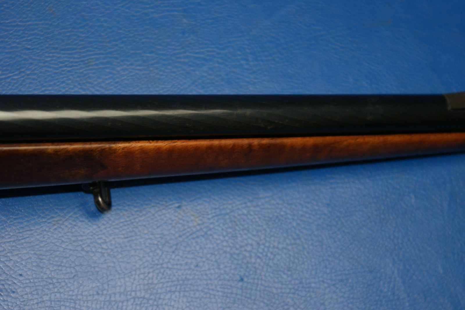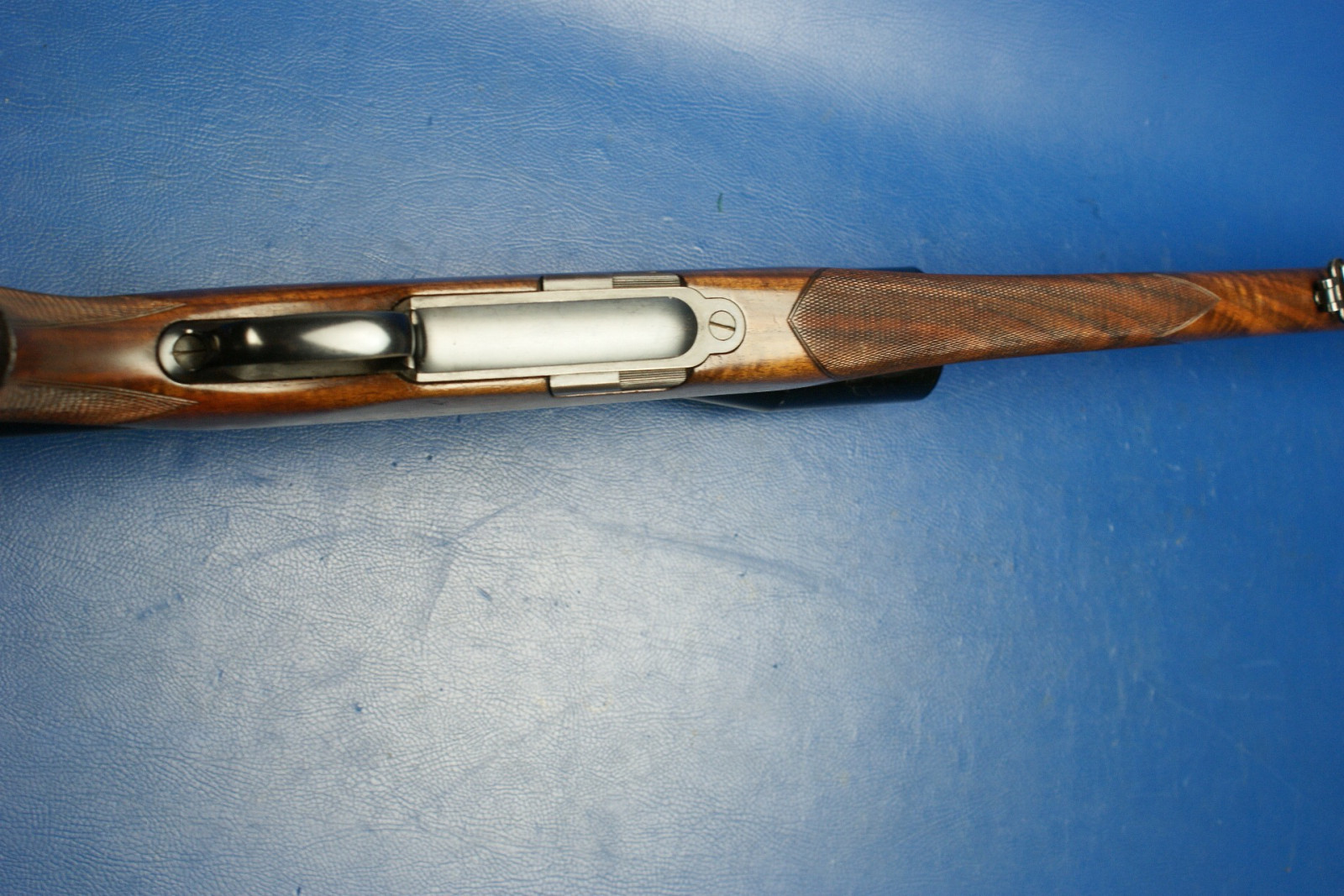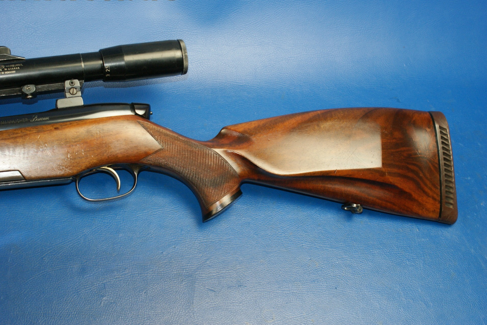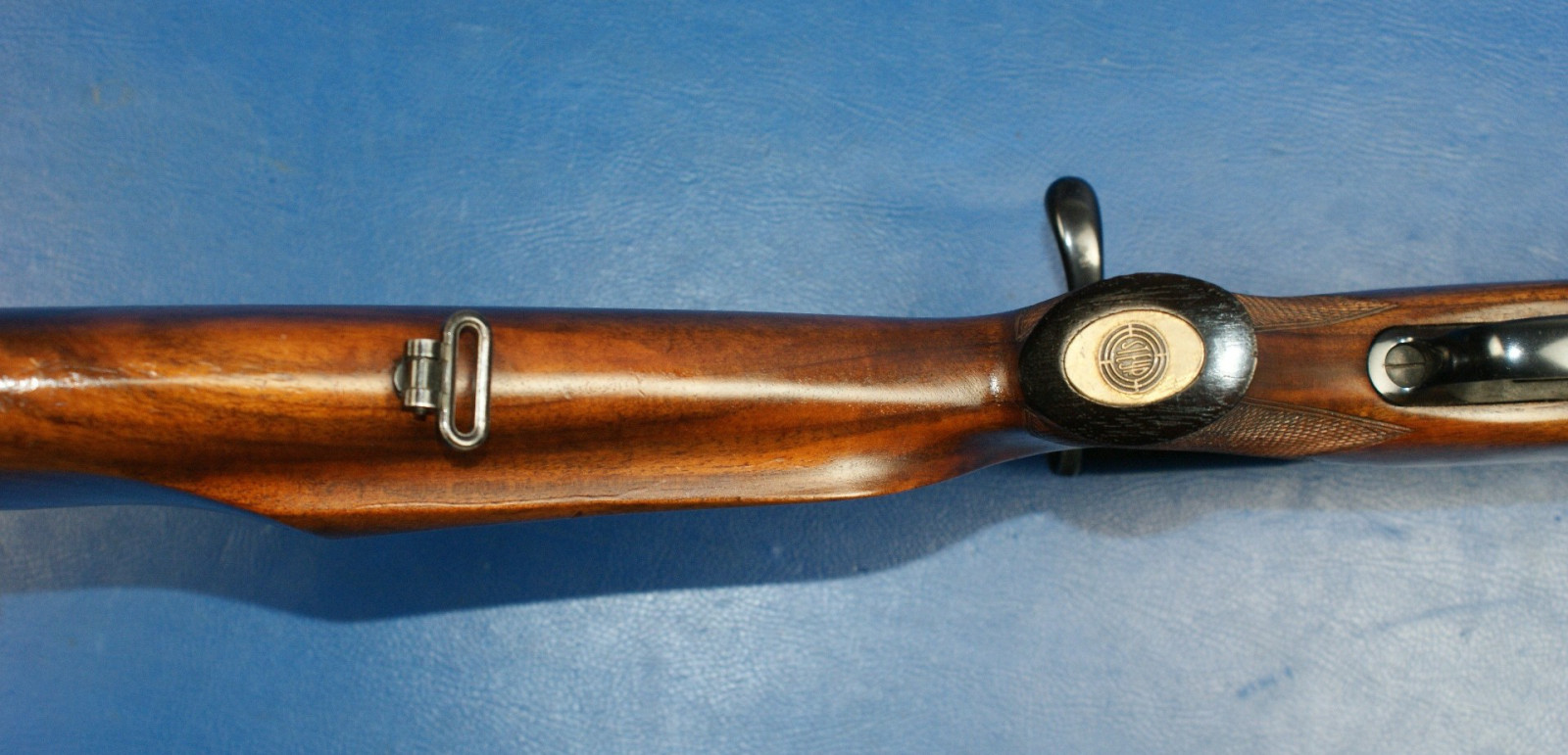 Französischer- bzw. Rückstecher (Abzugszunge wird nach vorne geschoben). Kaltgehämmerter Lauf. Schwenkmontage. Lager- und Gebrauchsspuren.