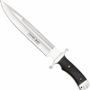 Ein traditionelles Bowiemesser. Die elegant geschwungene Parierstange und der verzierte Endknauf sind aus rostfreiem Stahl. Am Endknauf befindet sich eine Öse für einen Fangriemen.